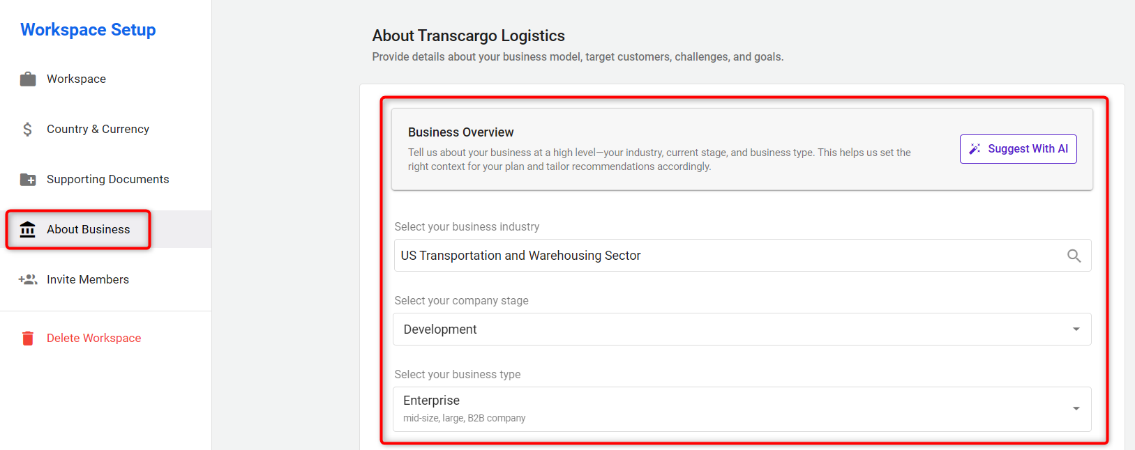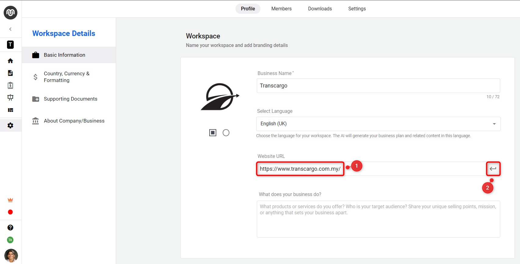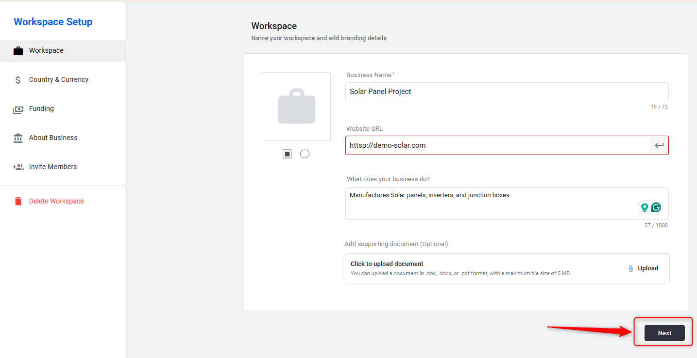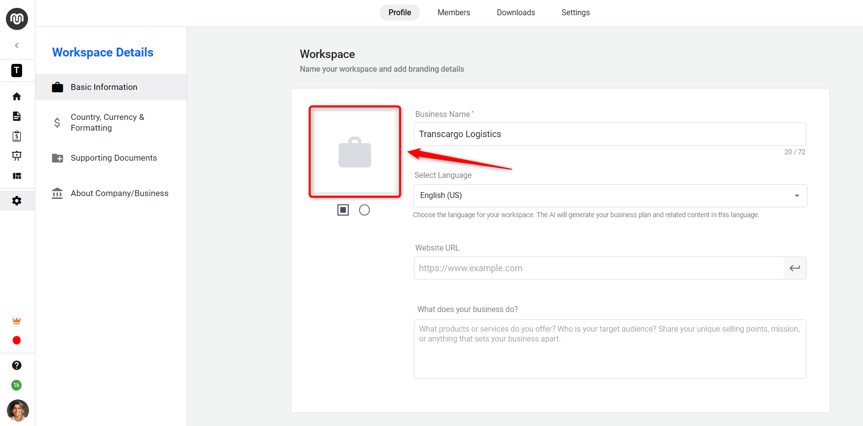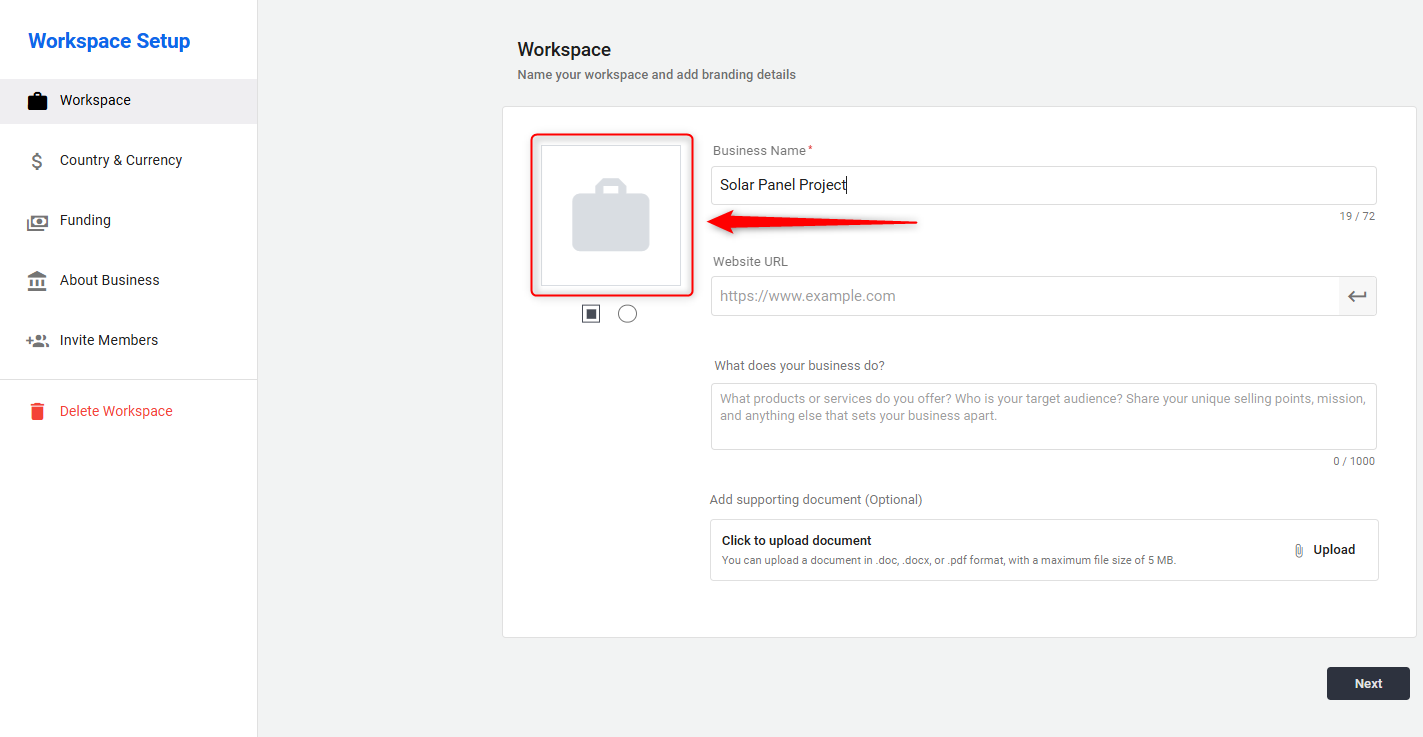 - Workspace Logo: In the Workspace section, upload your business logo.