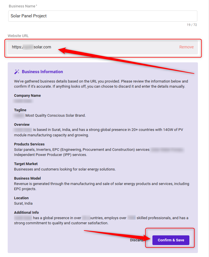- Website URL: Enter your website URL; this will auto-fetch your business details and populate the What does your business do? section. You can review, edit, or customize this information as needed.