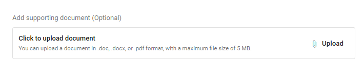 - Add Supporting Document (Optional): You may upload a supporting document (in .doc, .docx, or .pdf format) to provide more context. This helps AI better understand your business and generate a tailored plan.
