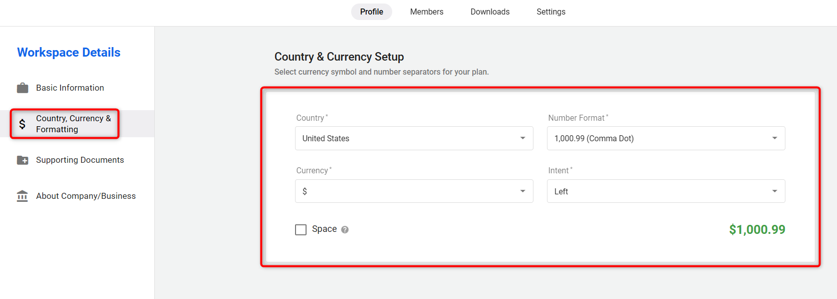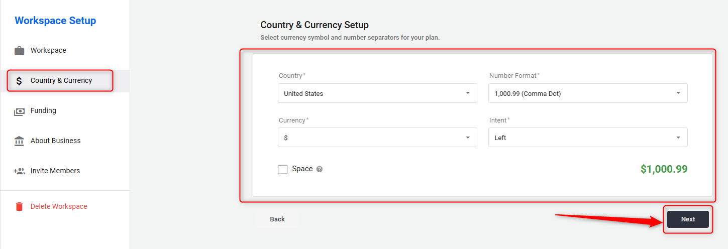 In the Country & Currency section, configure your Country, and the system will automatically apply the corresponding currency.