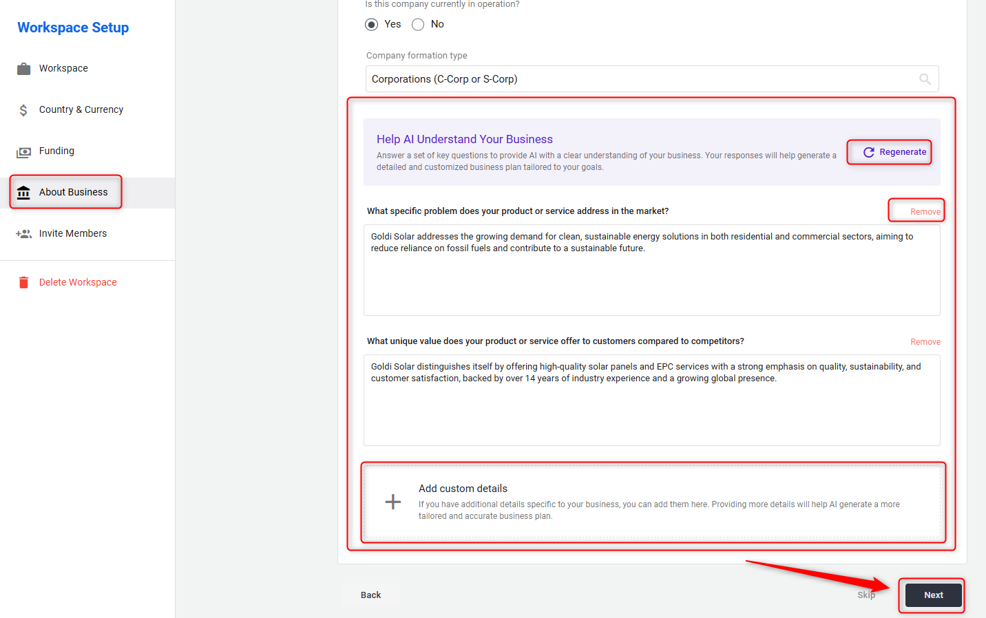 The About Business section utilizes AI Assistance to better tailor your business plan.