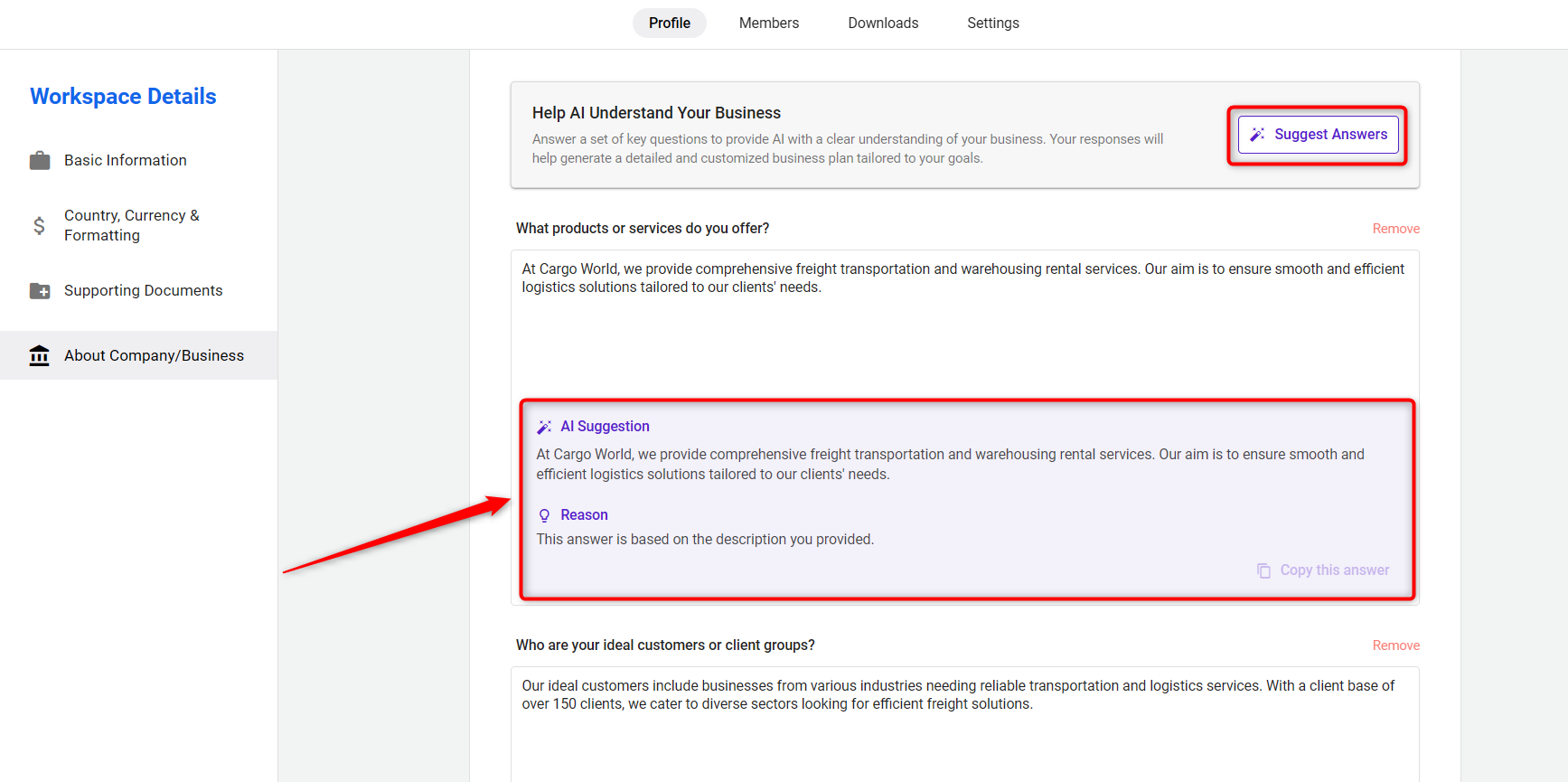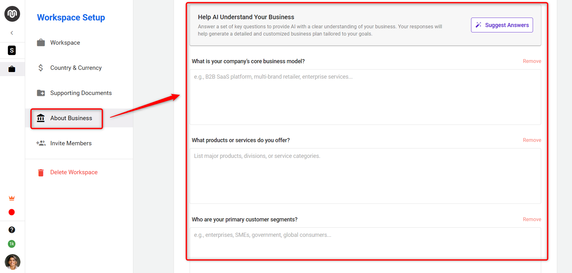 - Answer the AI-generated questions to share key insights about your business.