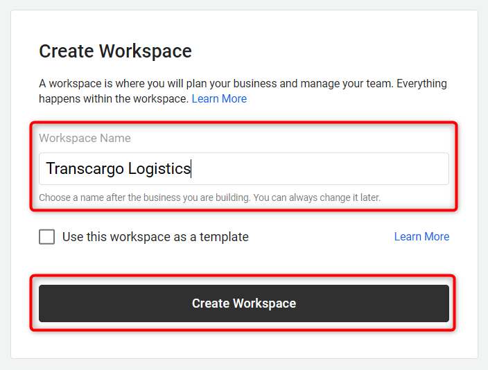 The next step in setting up your workspace involves defining the Workspace Name and clicking on Create Workspace to proceed further.