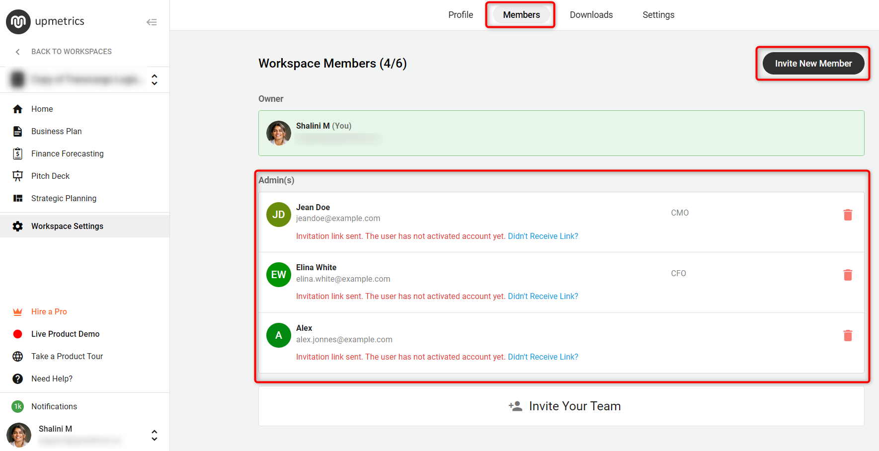 From the Members section, easily invite team members by email to collaborate in your workspace and share access to your template. By clicking on Invite New Member you can invite your team members by adding an email.