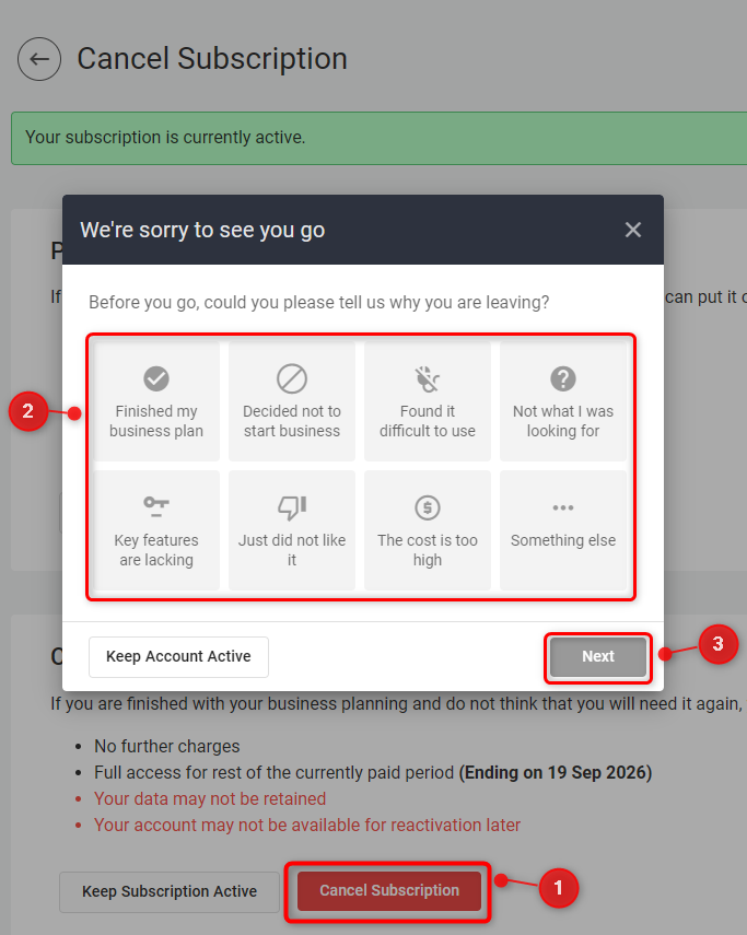 After clicking Cancel Subscription, a pop-up will appear asking you to choose a reason for your cancellation.