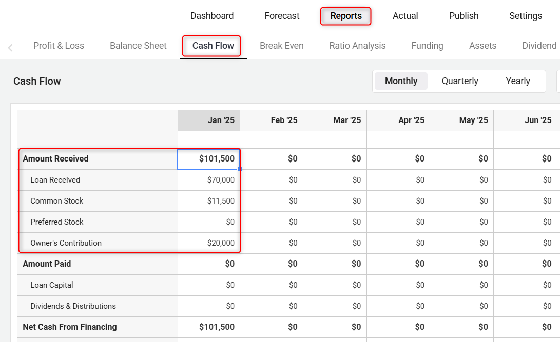 In the Cash Flow statement, these entries are highlighted under the Amount Received category.