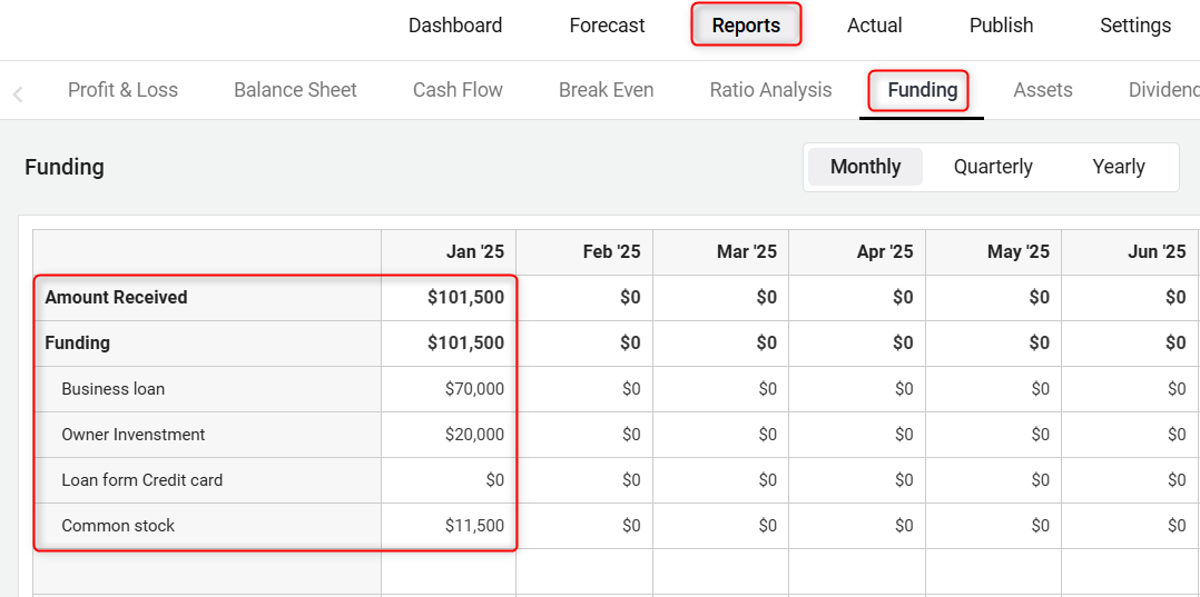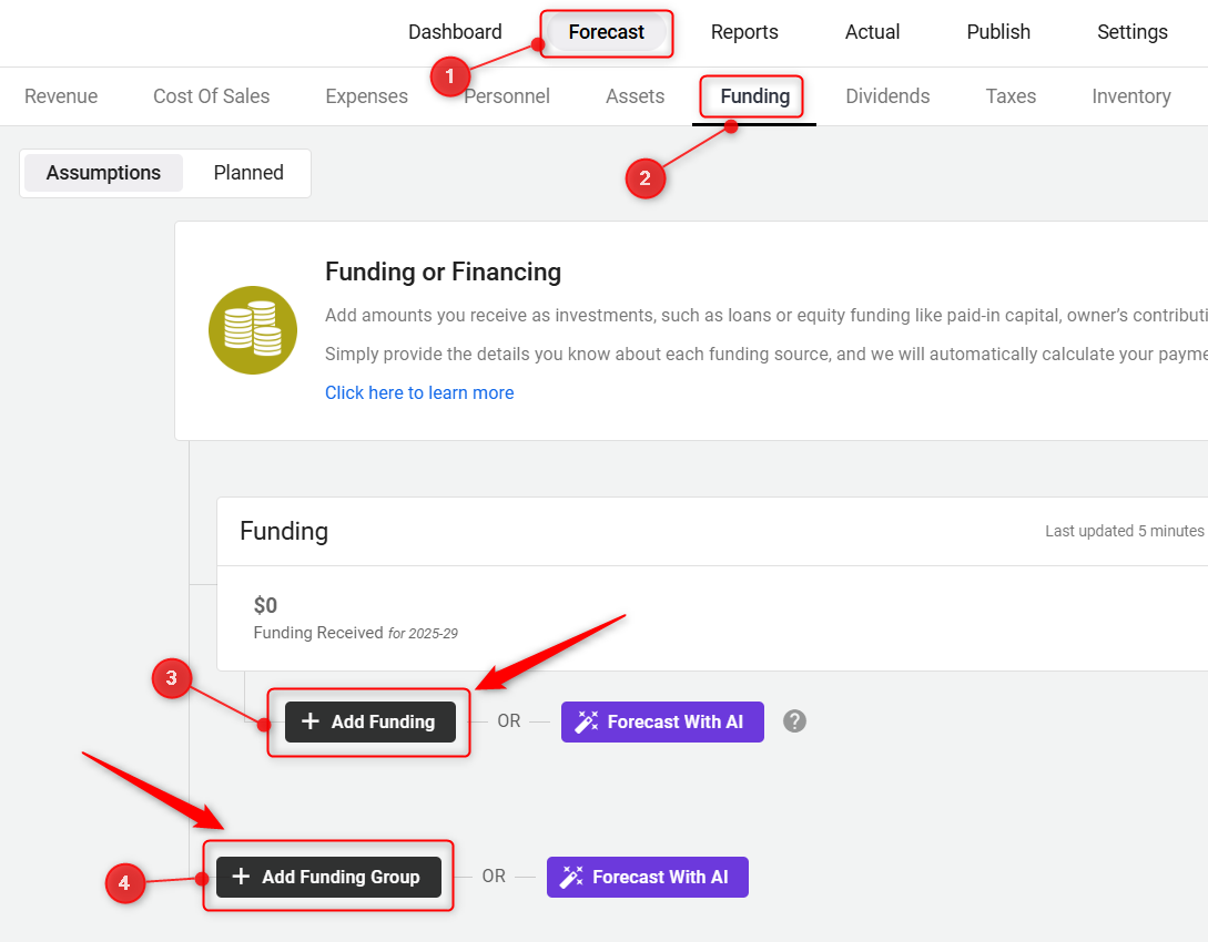 Within the Forecast tab, choose "Funding". Click on the "Add Funding Group" to add a new funding group or click on the "Add Funding" option.
