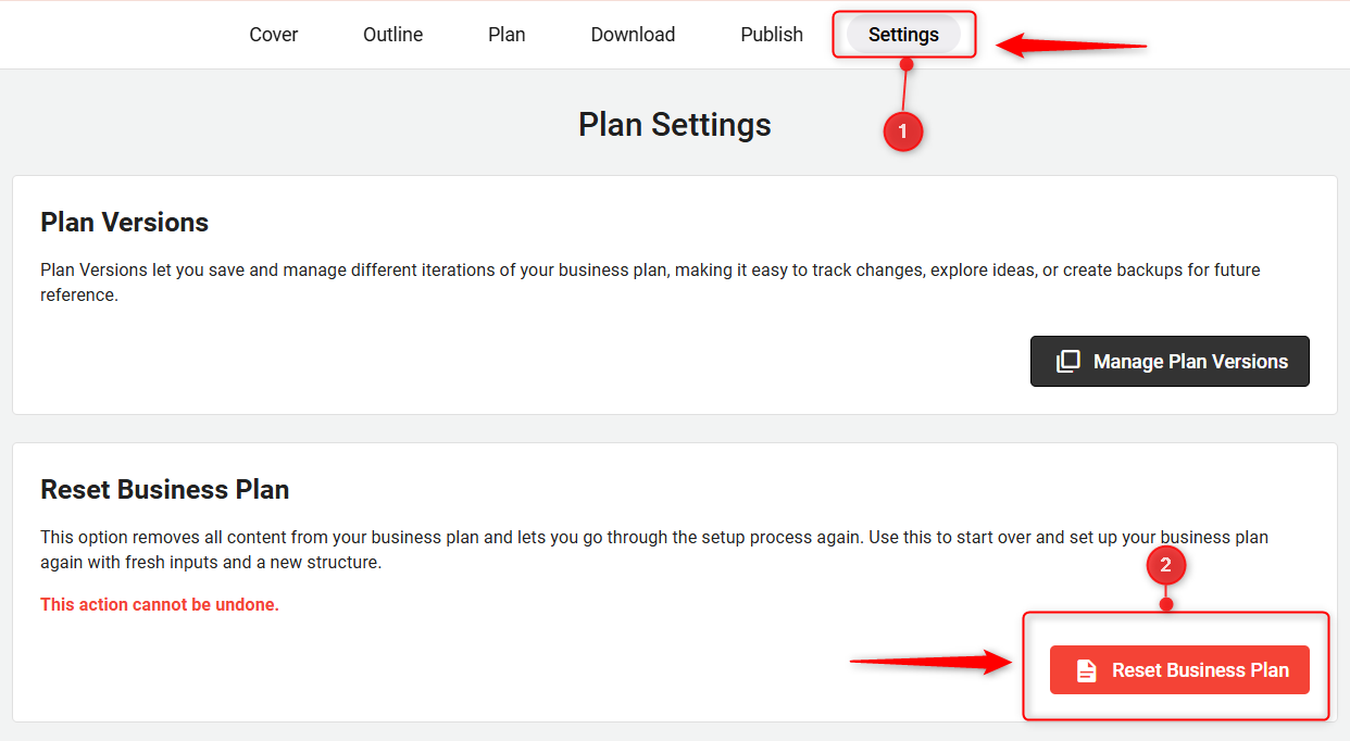 Then navigate to the Settings section and within it, look for the Reset Business Plan option and click on it.