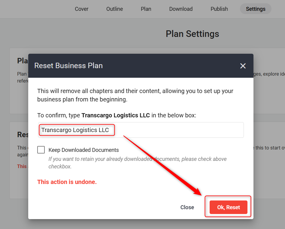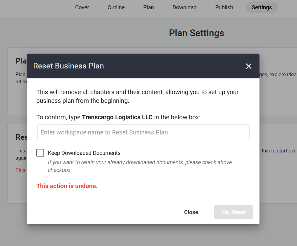 - Once you've correctly entered the workspace name, you'll see the Ok, Reset option is enabled, and click on it to reset your business plan.