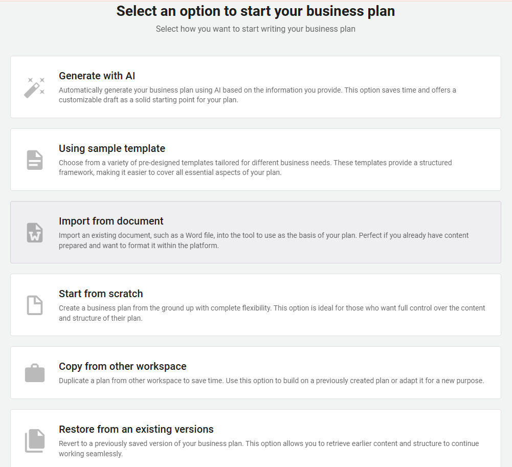 - Following a reset, you'll be redirected to select an option to start your business plan. Select your preferred configuration option for the business plan.