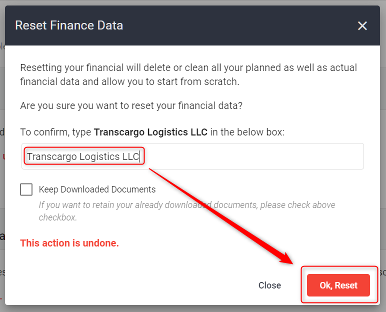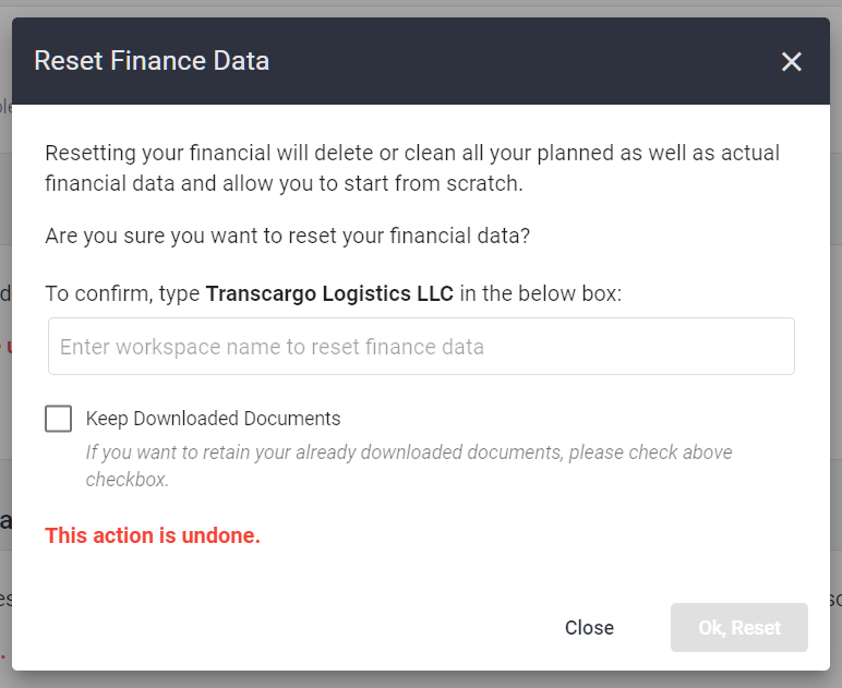 Once you've correctly entered the workspace name, the Ok, Reset option will be activated, and click on it to reset your finance data.