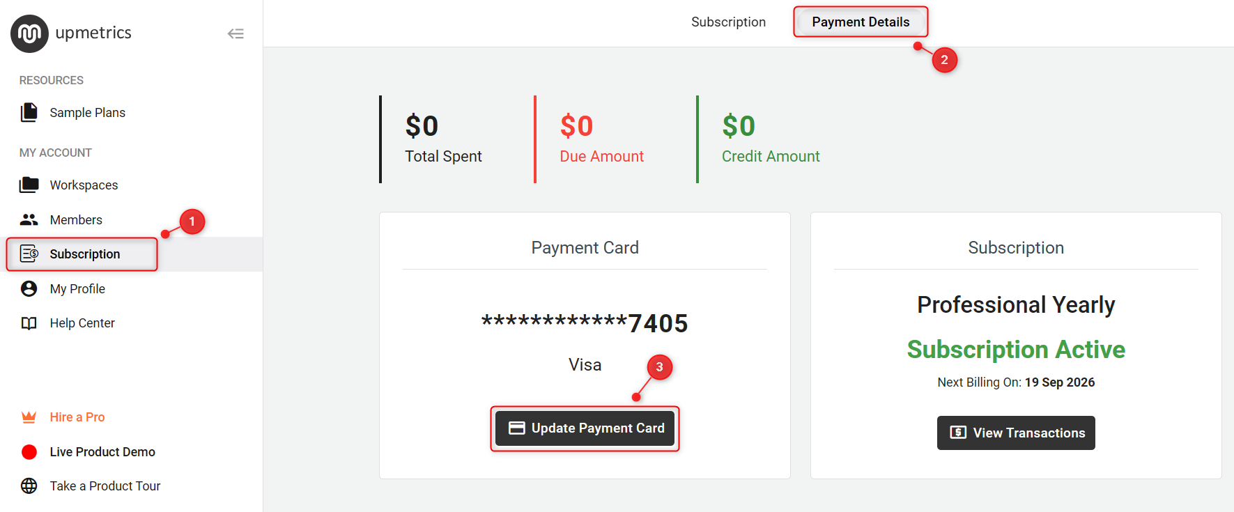 In the subscription area, find and click on the "Payment Details" option. This is where all your current payment information is stored. Look for the "Update Payment Card" option.