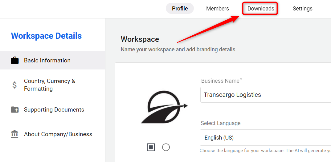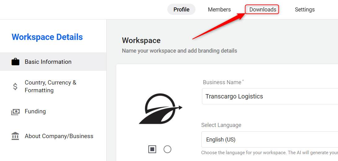 Within the workspace settings, locate and select the "Downloads" option.