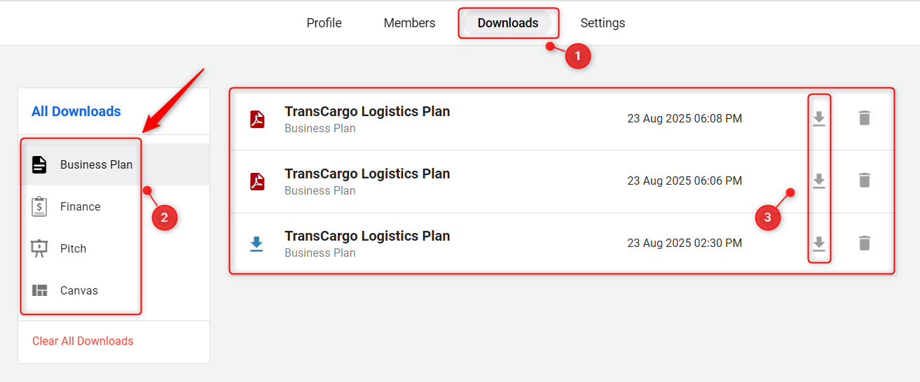 There's a handy section in your workspace where you can quickly see all your downloaded documents be it pitch decks, business plans, or canvases, along with the dates they were downloaded.