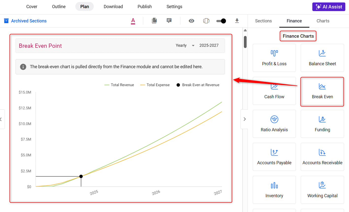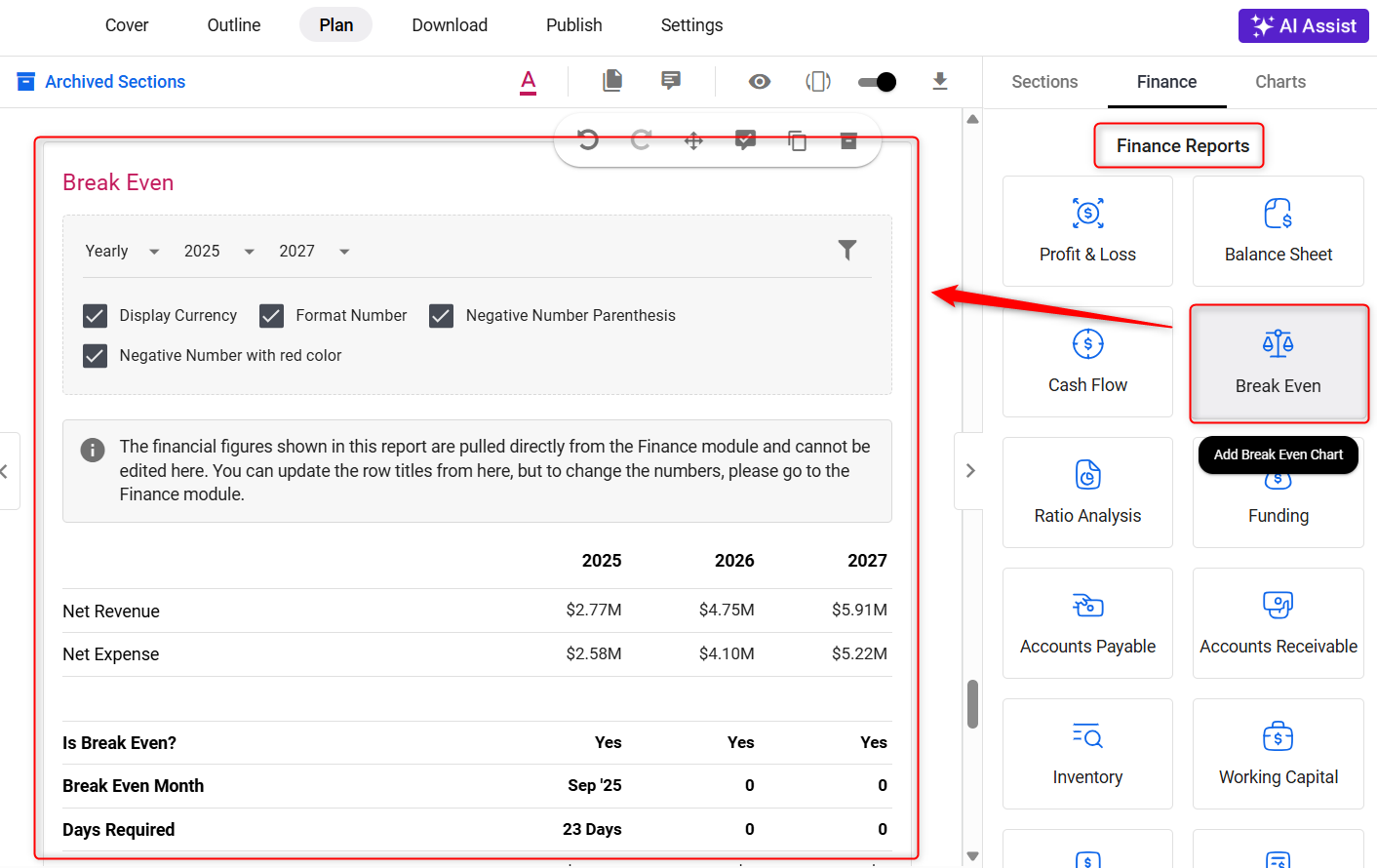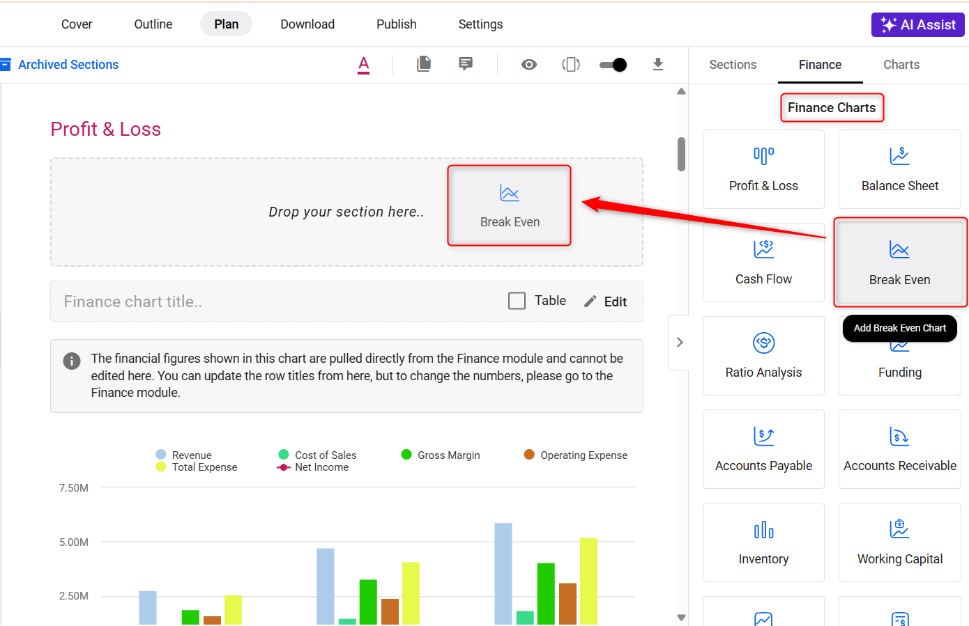 In the Finance section, look for the ‘Break-Even’ option. Utilize the drag-and-drop feature to add a Break-Even Analysis to your business plan.