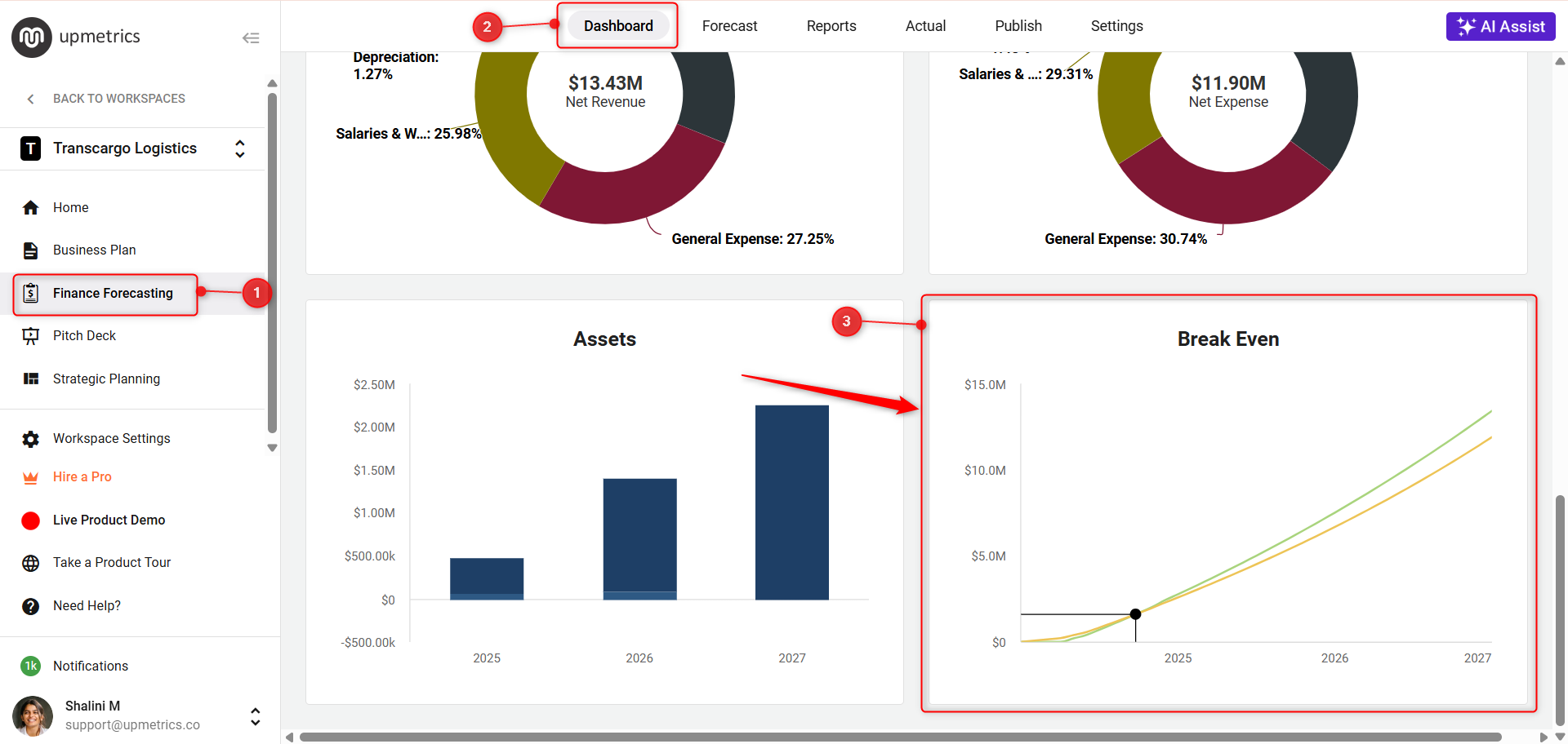 Moreover, you can also view the Break-Even Analysis on the dashboard section of the Finance Forecast module. This visualization helps you understand at a glance when your business is expected to start generating profit, beyond just covering expenses.