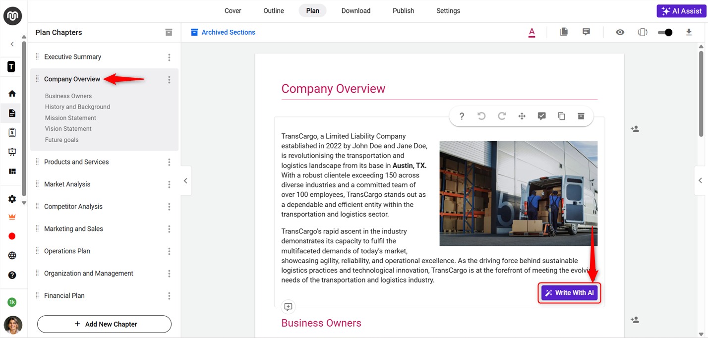 Navigate to the section of your business plan that you want to translate. Click on the Write With AI button located within the section editor.