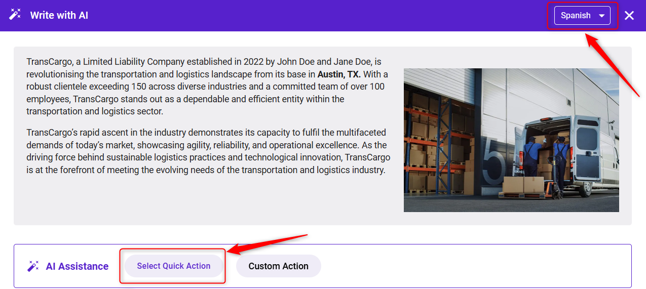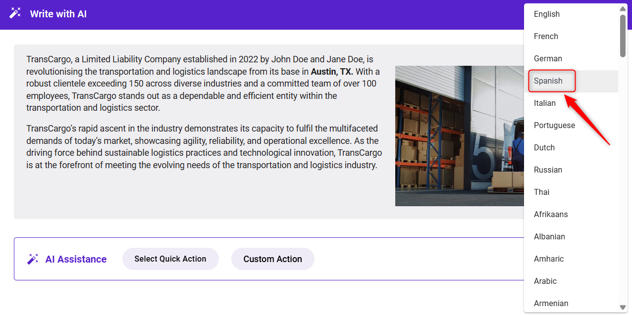 On the top-right side form the language dropdown menu, select your preferred language for translation, like French, German, Spanish, Italian, Dutch, etc.i.e., Let’s translate Business Plan content from English to Spanish: