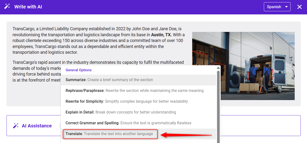 Under the General Options, you can use the Translate feature to convert any section into your preferred language. In addition to translation, the AI Assistant helps you summarize sections, rephrase or simplify complex content, rewrite in detail for better clarity, and correct grammar and spelling instantly.