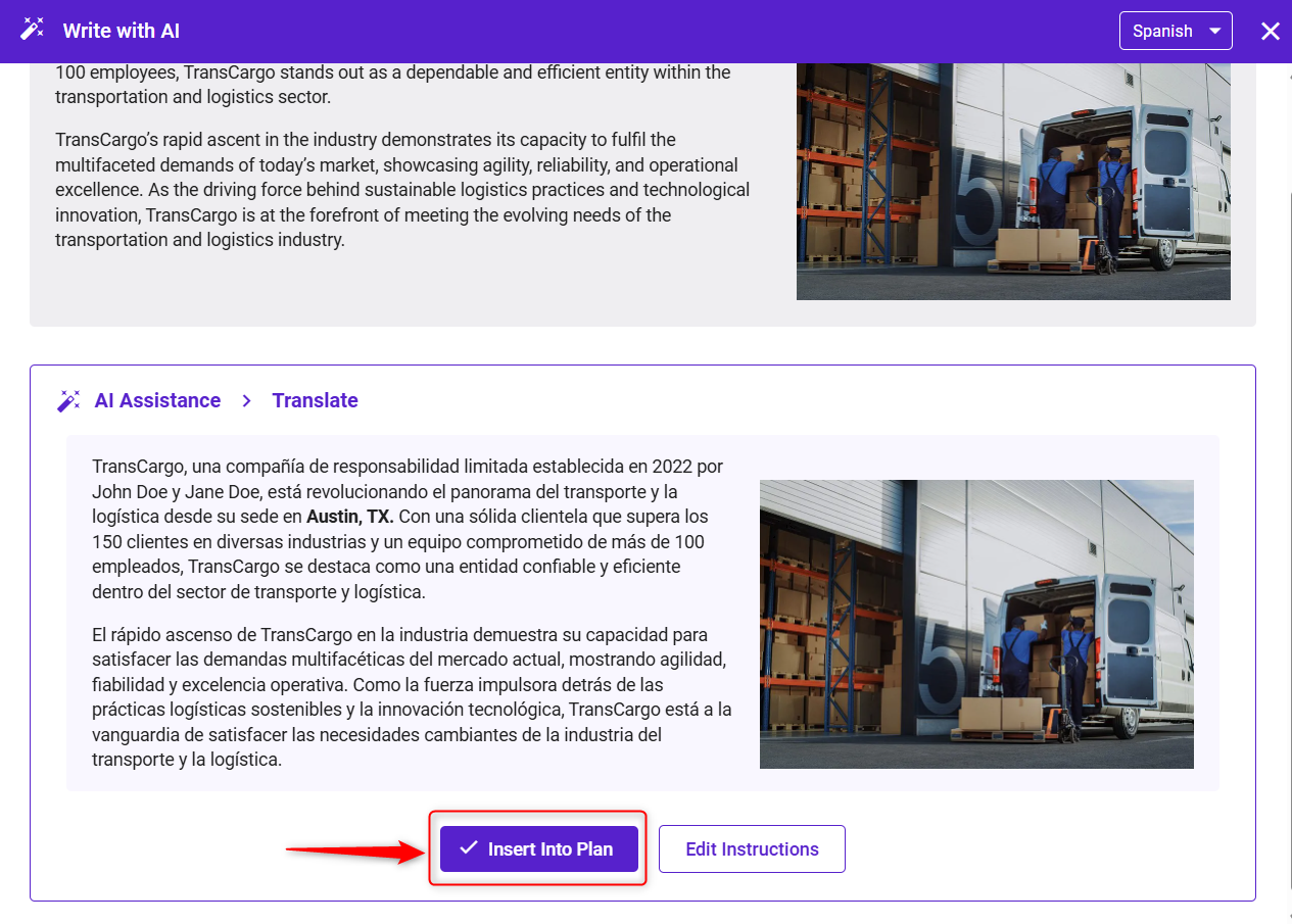 Once the translation is complete, save it directly to your business plan and click on Insert Into Plan. If you wish to refine the translation further, click on Edit Instructions.