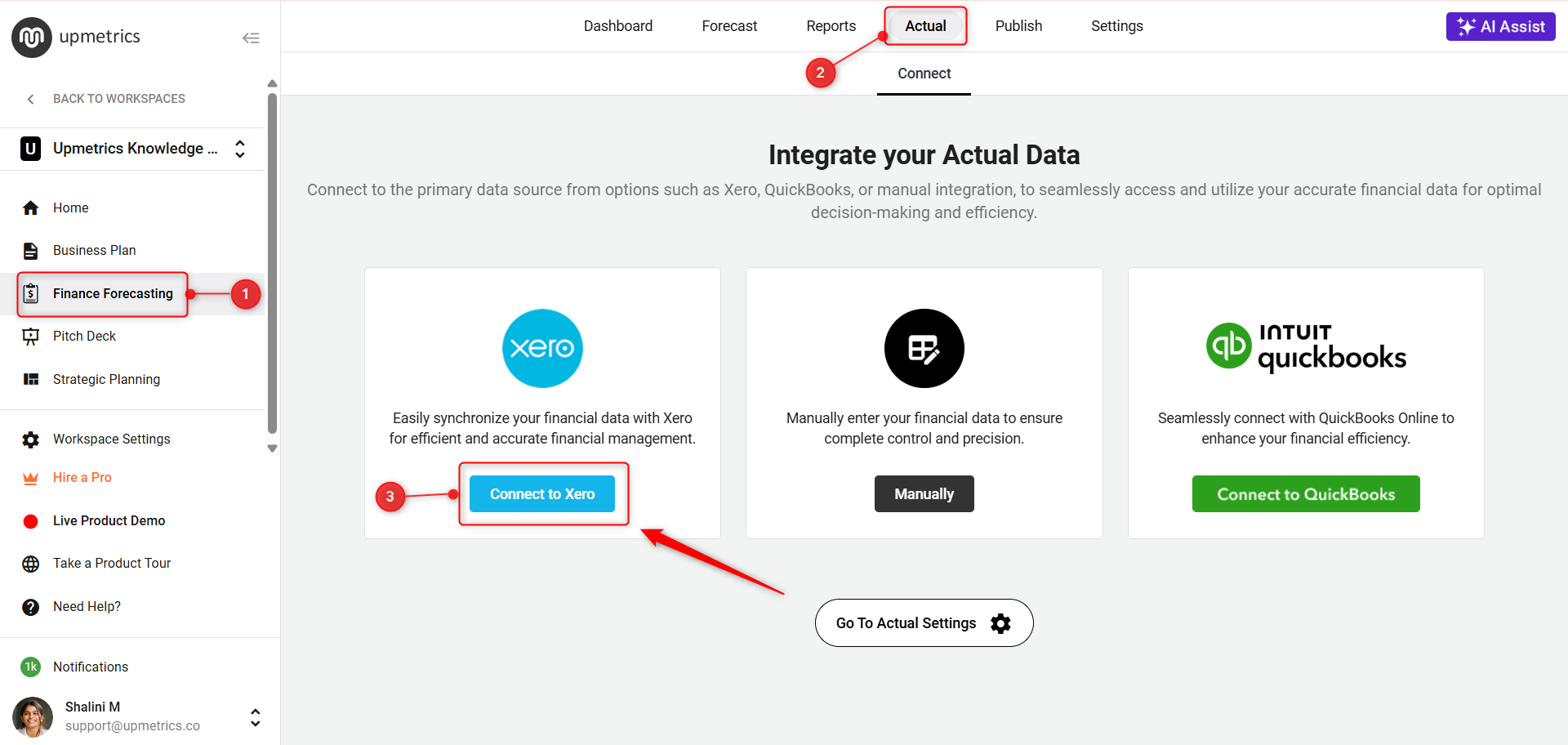 Ans. You can easily disconnect the Xero and Upmetrics connection from the "Actual" tab of the Upmetrics Finance Forecasting module.