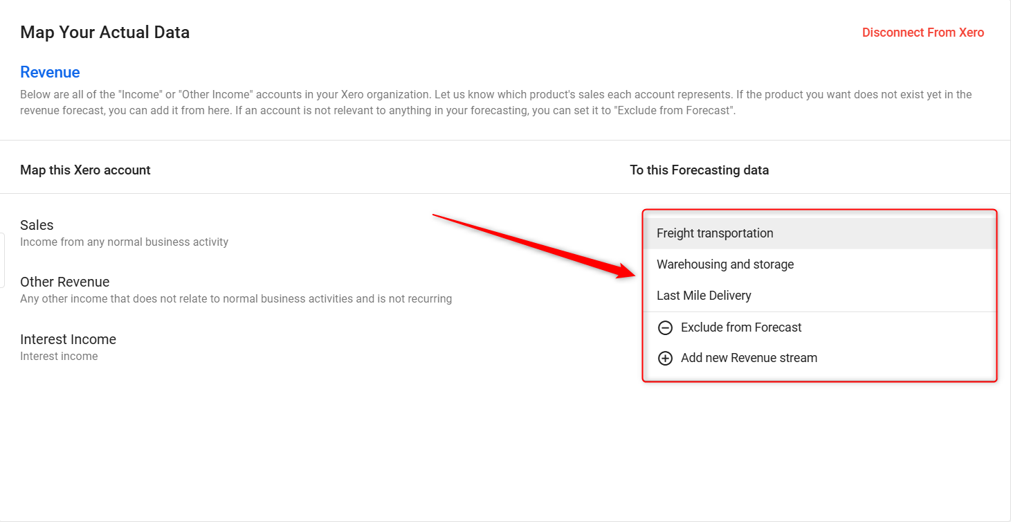 When you click on an 'Unmapped' category, options will appear allowing you to select the forecast streams to map with the corresponding Xero Chart of Accounts (COA). The system saves the data in real-time, so there is no need to save it manually.