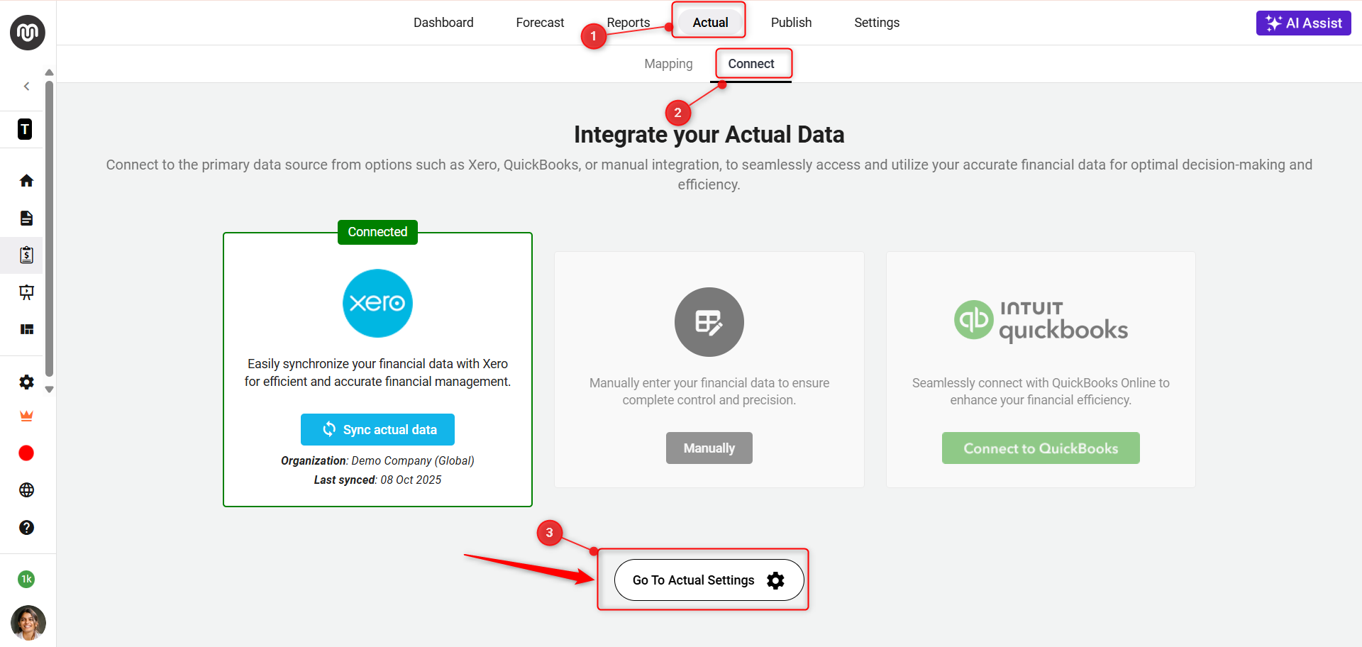 Navigate to the Finance Forecasting module and click on the "Actual" tab. Choose the Xero accounting system and click on the "Connect to Xero" option.