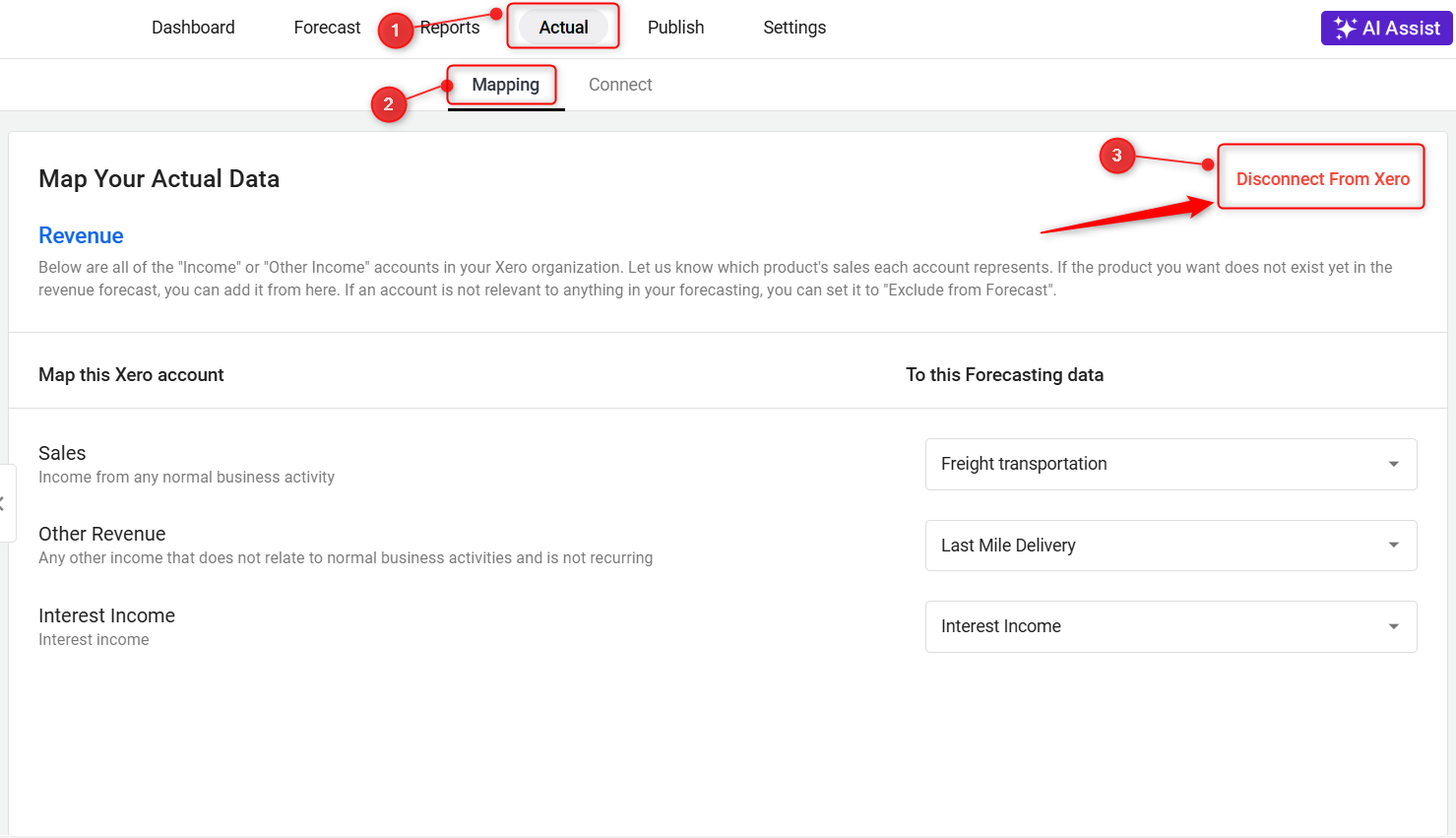 Navigate to the Finance Forecasting module in and select the “Actual” tab. Locate and click on the “Disconnect From Xero” option found under the mapping section.