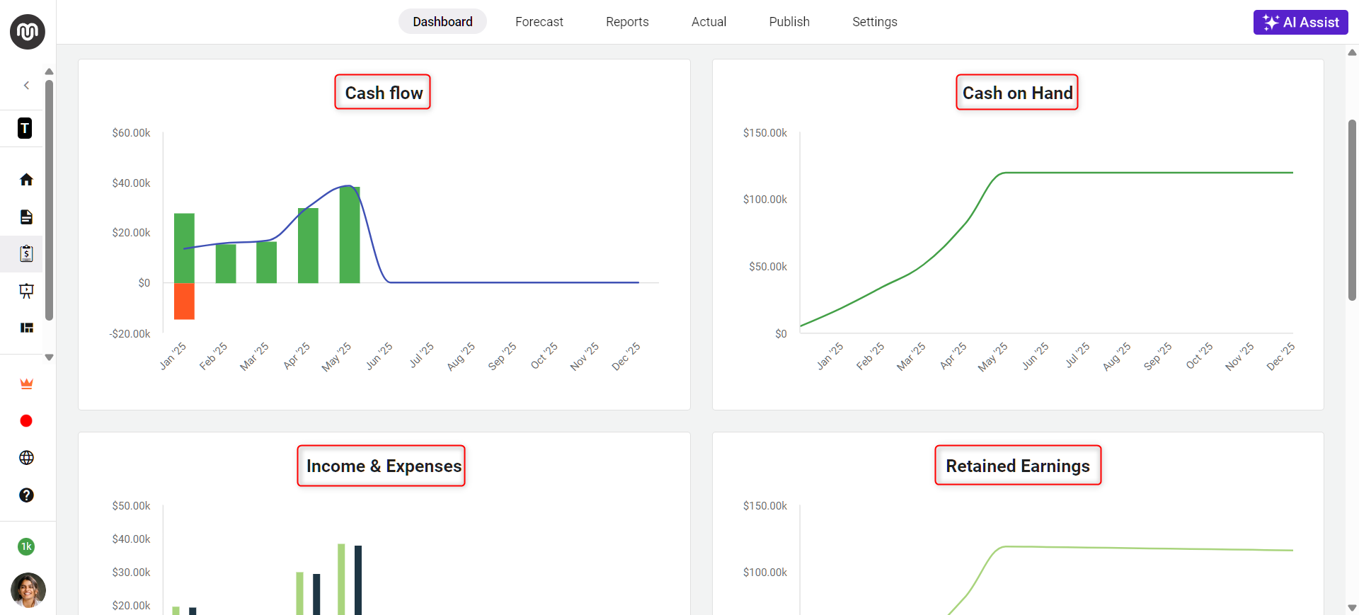 The dashboard displays several charts, including Cash Flow, Cash on Hand, Income & Expenses, Retained Earnings, Break-Even, and others.