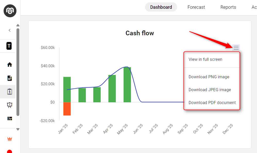 This guide ensures that you can easily manage and download the necessary financial charts, providing a visual representation of your data in the format best suited for your analysis or presentation needs.