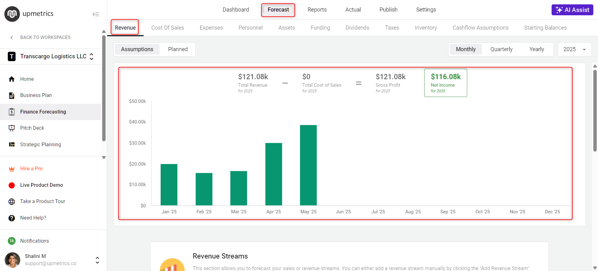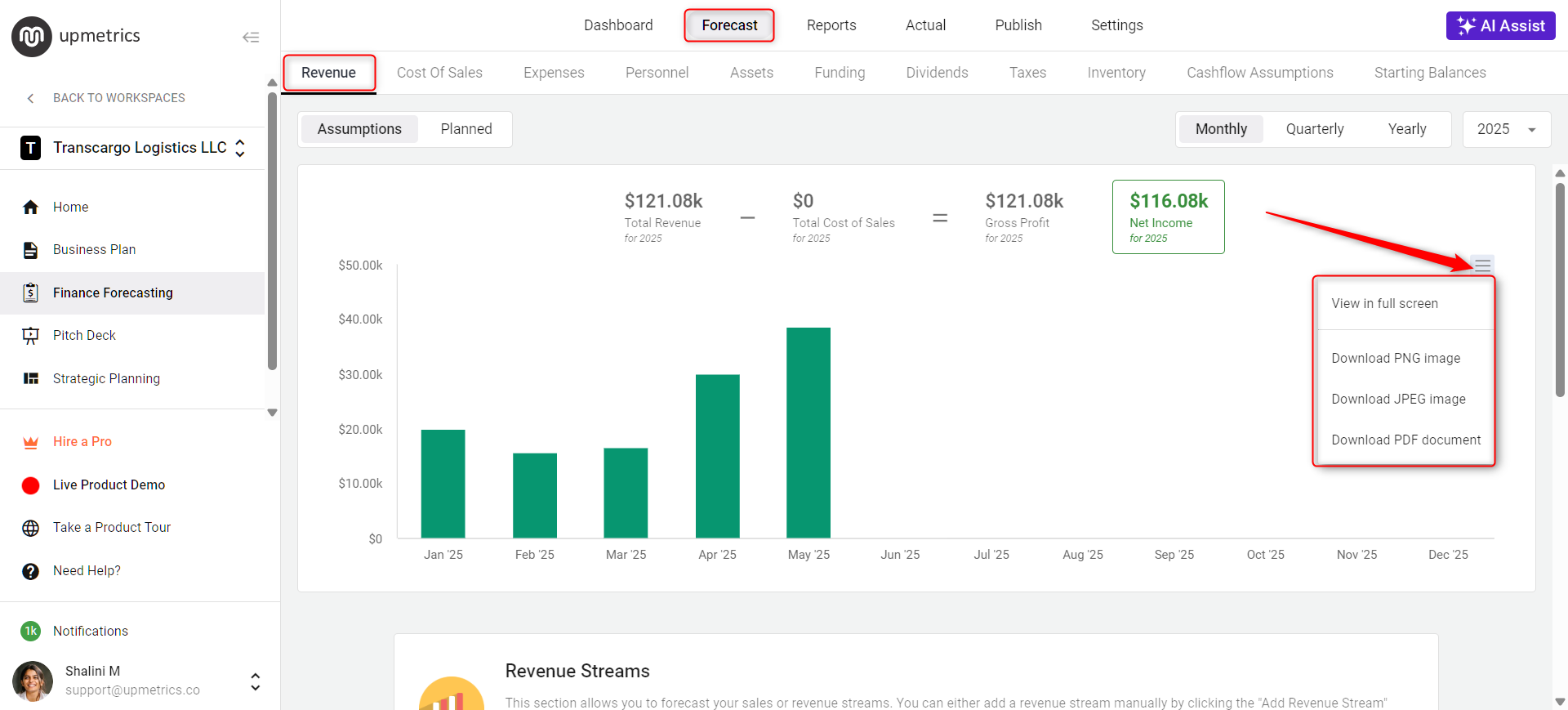 Choose the finance stream you need a chart from, such as Revenue, COS, Expenses, Personnel, or Working Capital. You'll find each stream's chart displayed.