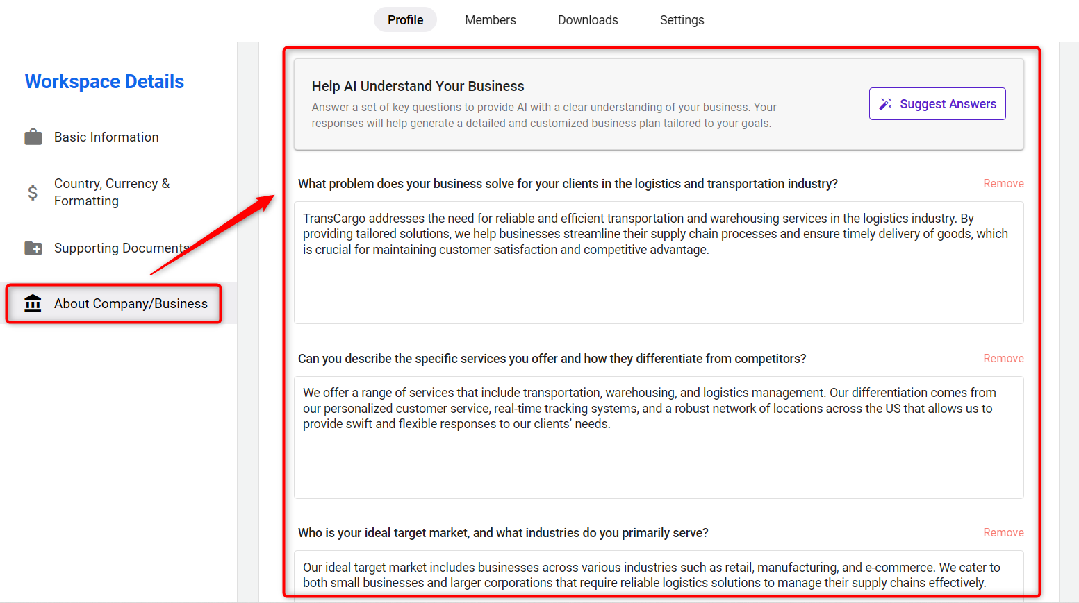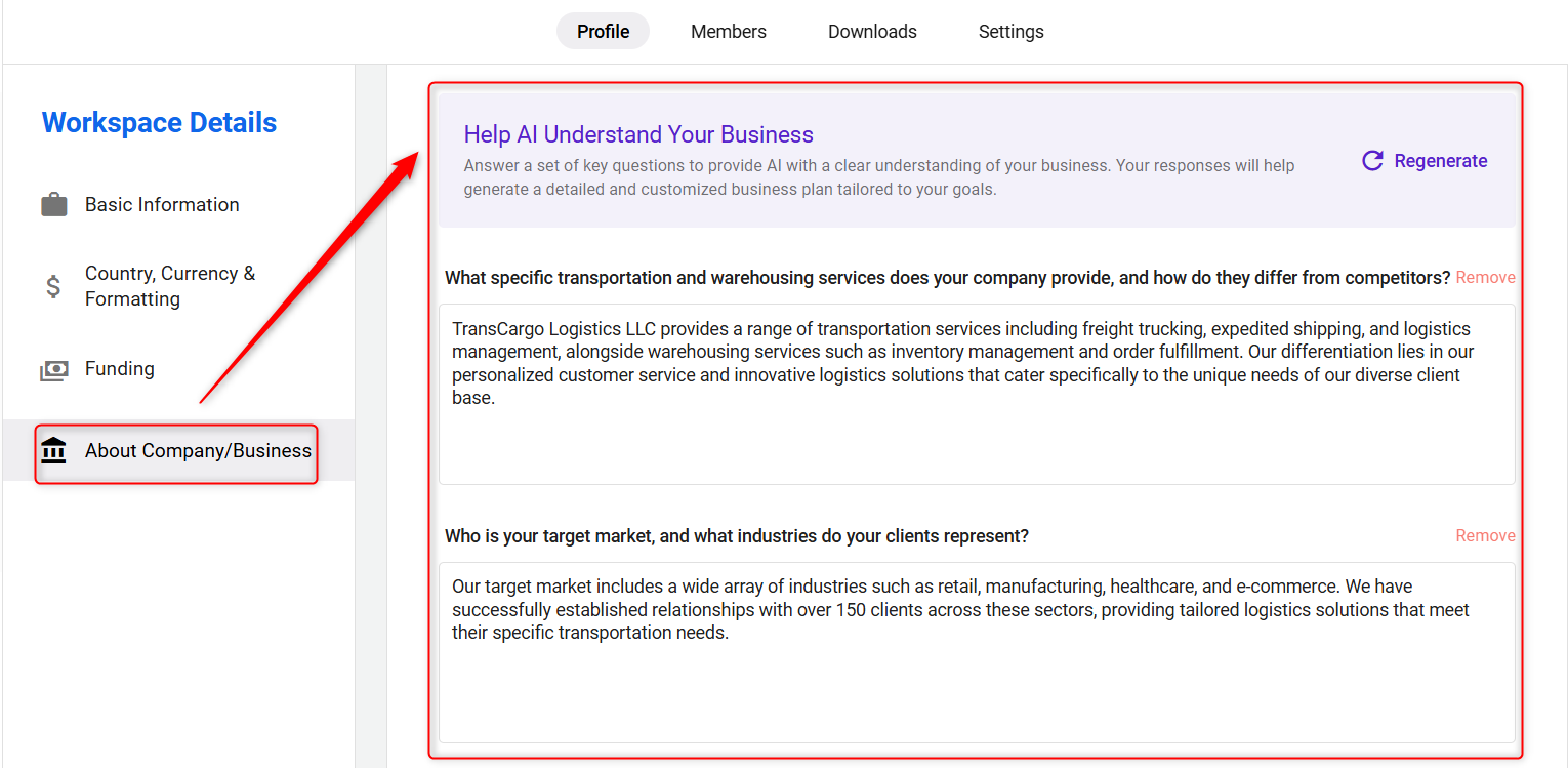 Within the Workspace Details, locate the About Company/Business section found under the Profile option. Here, you will find your AI-generated questions. You can view and revise your answers as needed to meet your current requirements.