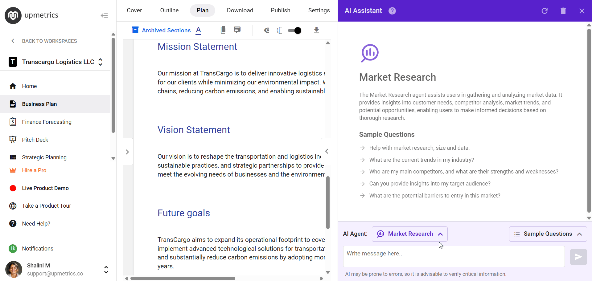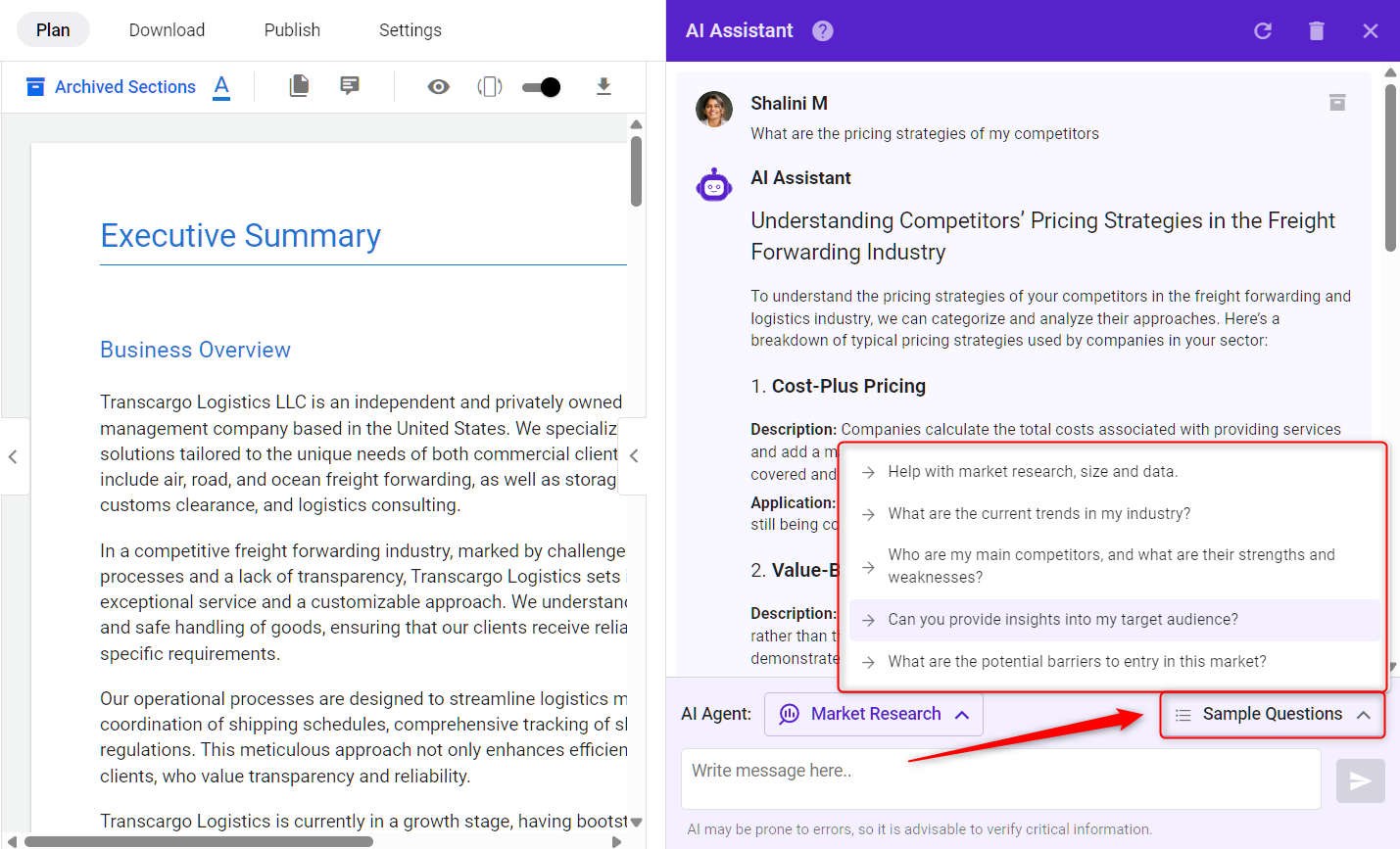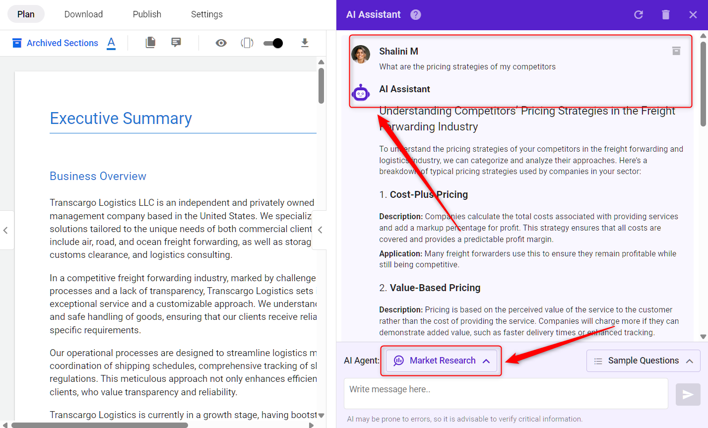 Simply ask questions to the relevant AI Research Agent and receive detailed, actionable feedback to optimize your business plan. This guide will introduce you to the capabilities of the Plan Analyst, Market Research, and Financial Analyst agents, helping you harness their potential to drive your business forward.