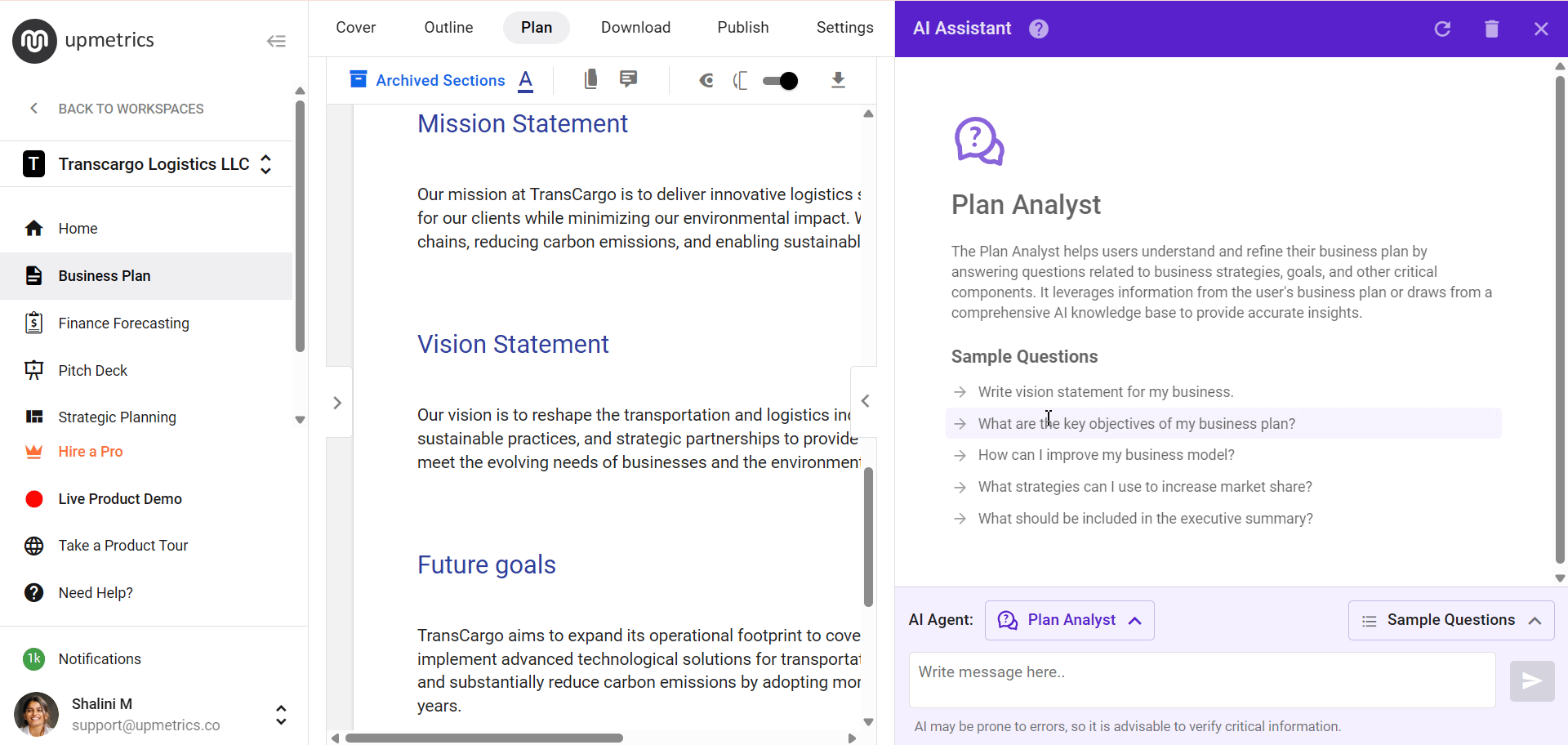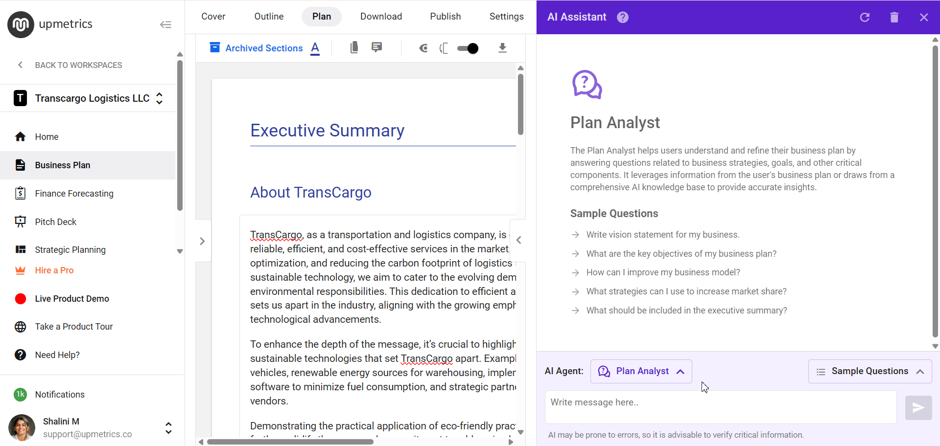 The Plan Analyst is designed to help in the development and refinement of your business plan. This agent acts as a critical-thinking partner, helping to clarify and enhance your business strategies and goals.