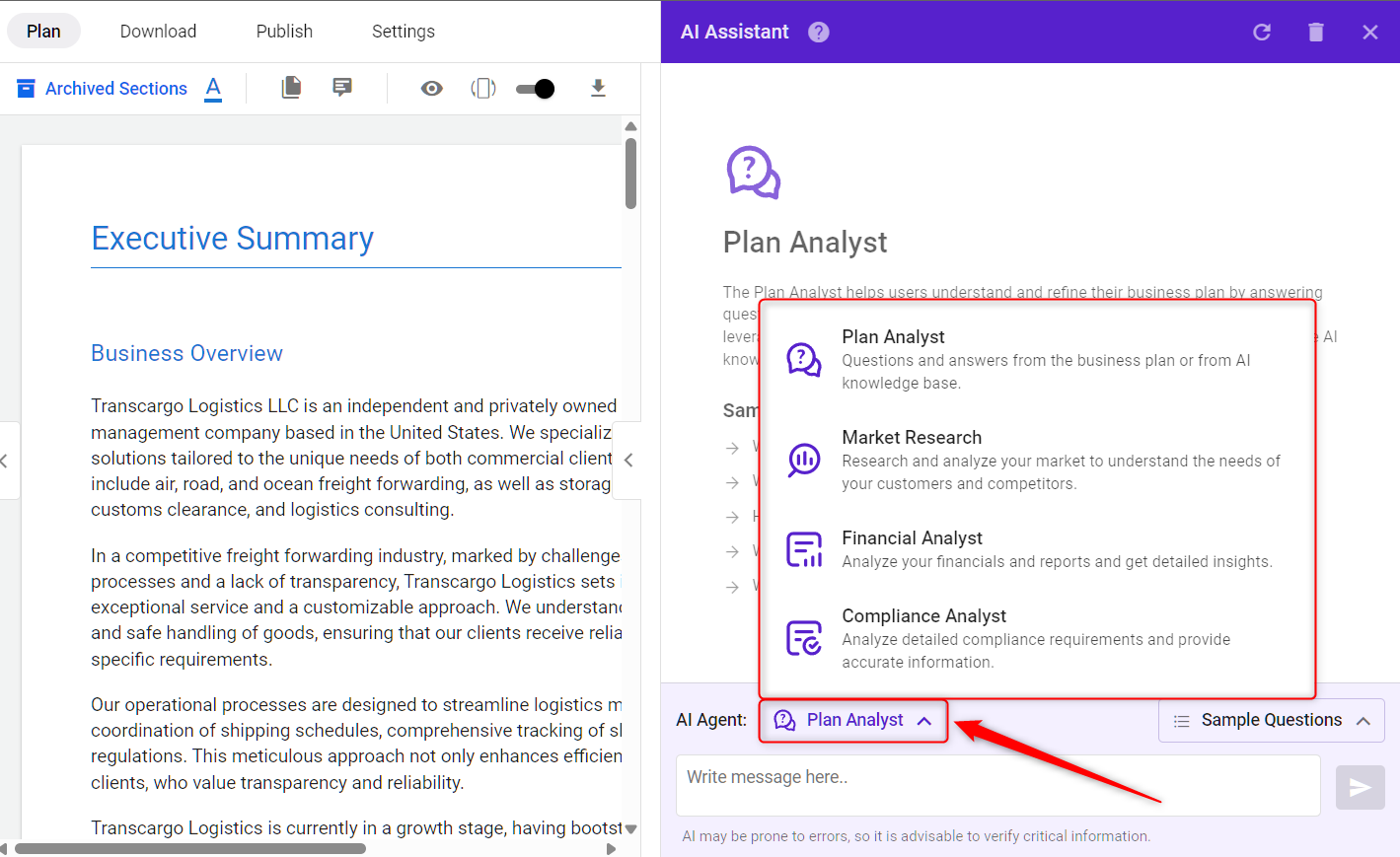 To assist in this critical process, AI Agents are powerful tools designed to enhance your planning experience. Whether it's refining your business strategy, conducting in-depth market research, or analyzing financial projections, our AI Agents are equipped to provide tailored answers to all your questions.