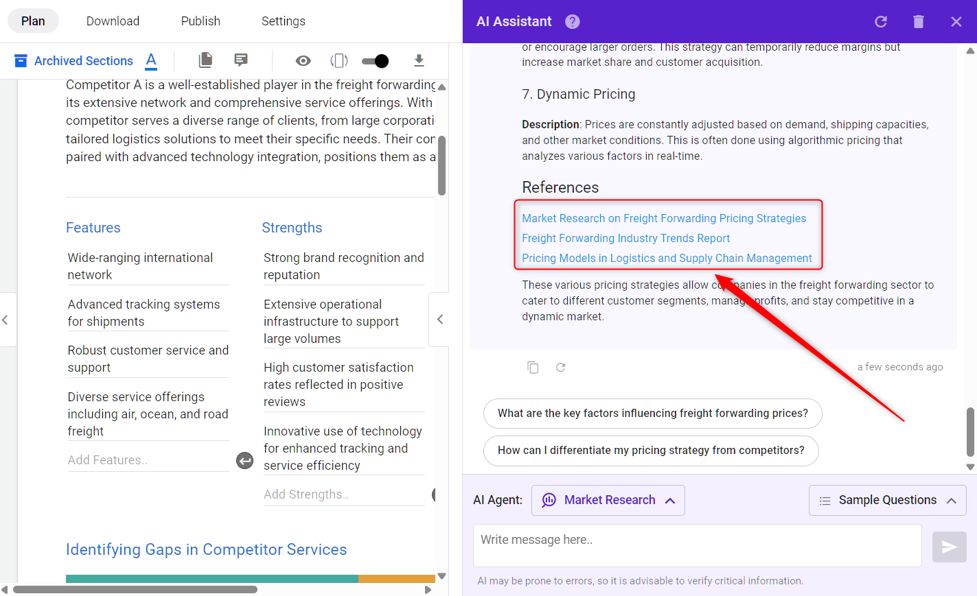 You can then enter questions directly into the AI interface, such as, "What are the pricing strategies of my top competitors?" Hit enter or click send to process your query.