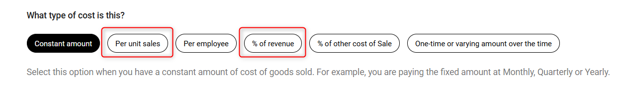 - Per Unit Sales: This option is directly linked to the units that are configured or sold within specific revenue streams. Because it depends precisely on the sales volume of that particular product or service, moving it to another group where the unit sales configuration does not apply would disrupt the accuracy of your cost calculation.