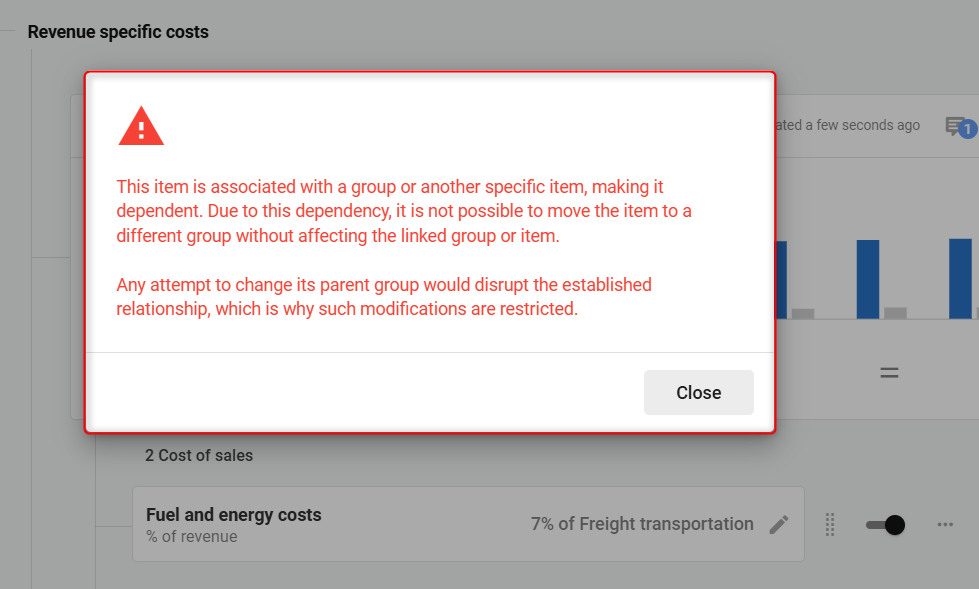 NOTE: If the selected item is dependent on another item or a specific calculation within its current group, you may encounter a warning stating that it cannot be moved independently. In such cases, you need to either move the parent item or adjust the dependencies first.