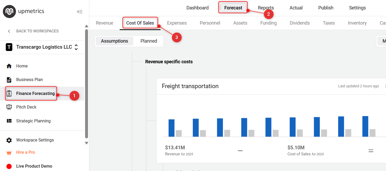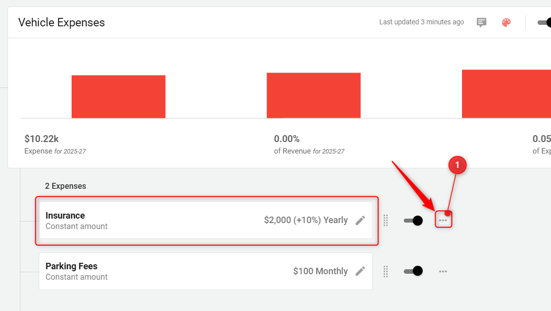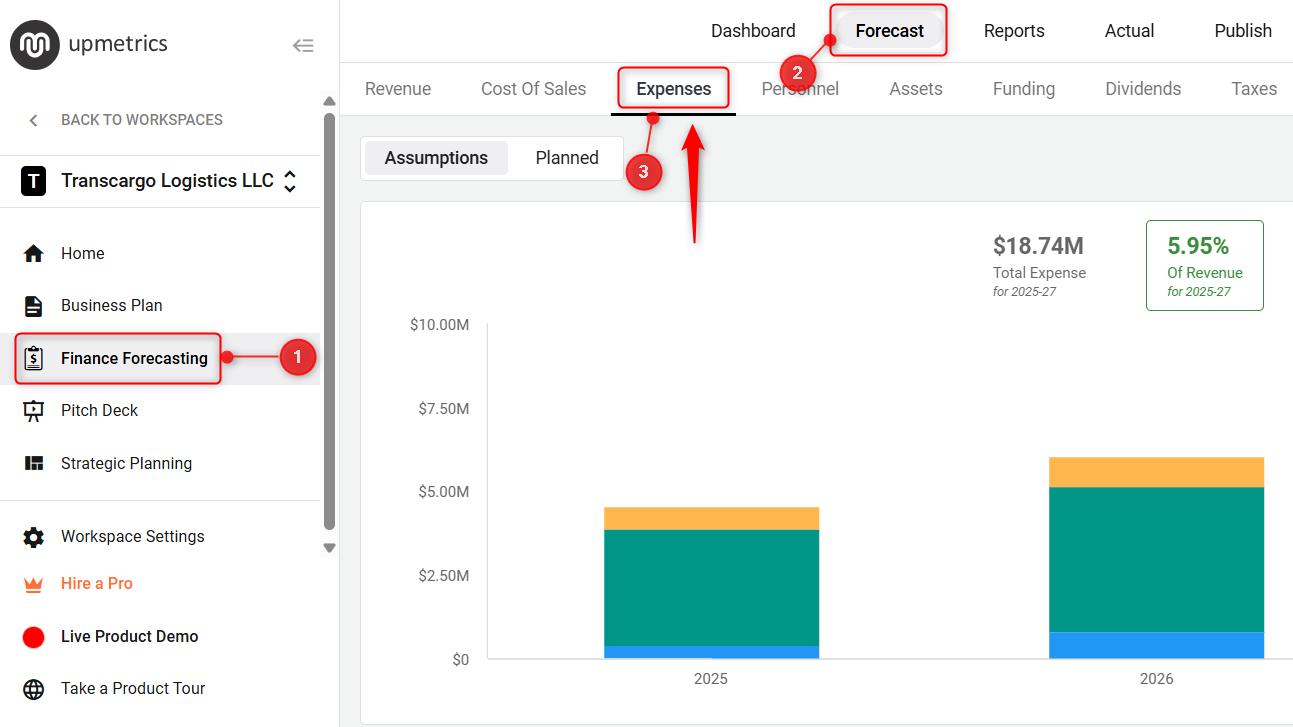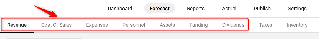 Open the finance forecasting module and here click on the “ Expenses” tab to view all categories and items listed under your operating expenses.