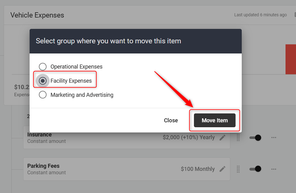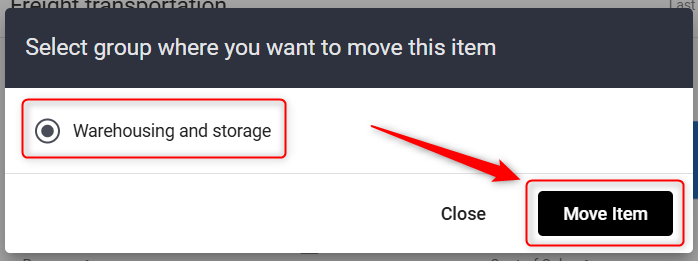 Choose the appropriate group where you want the expense item to be relocated. Confirm the move by selecting the new group and clicking ' Move Item'.