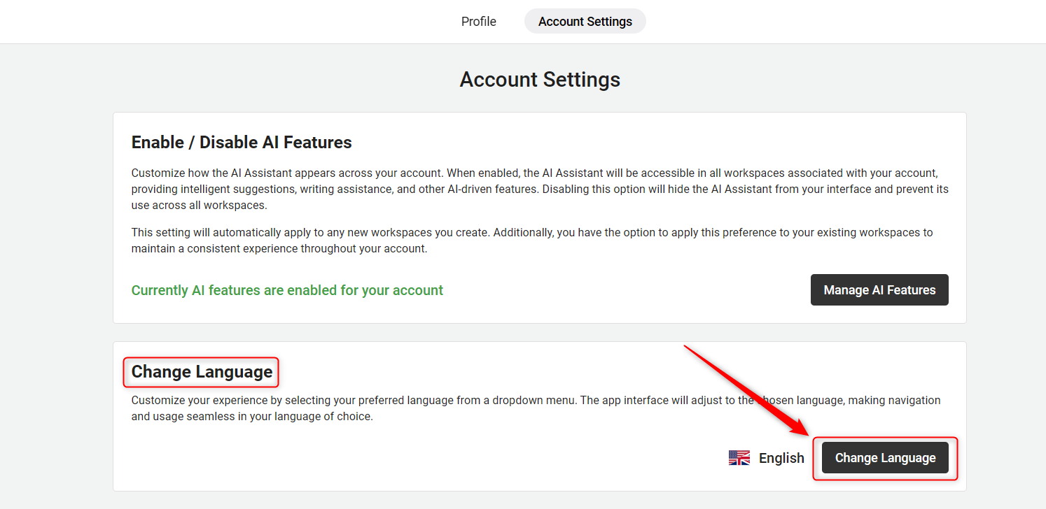 Within the Account Settings, navigate to the Change Language section and click on it.