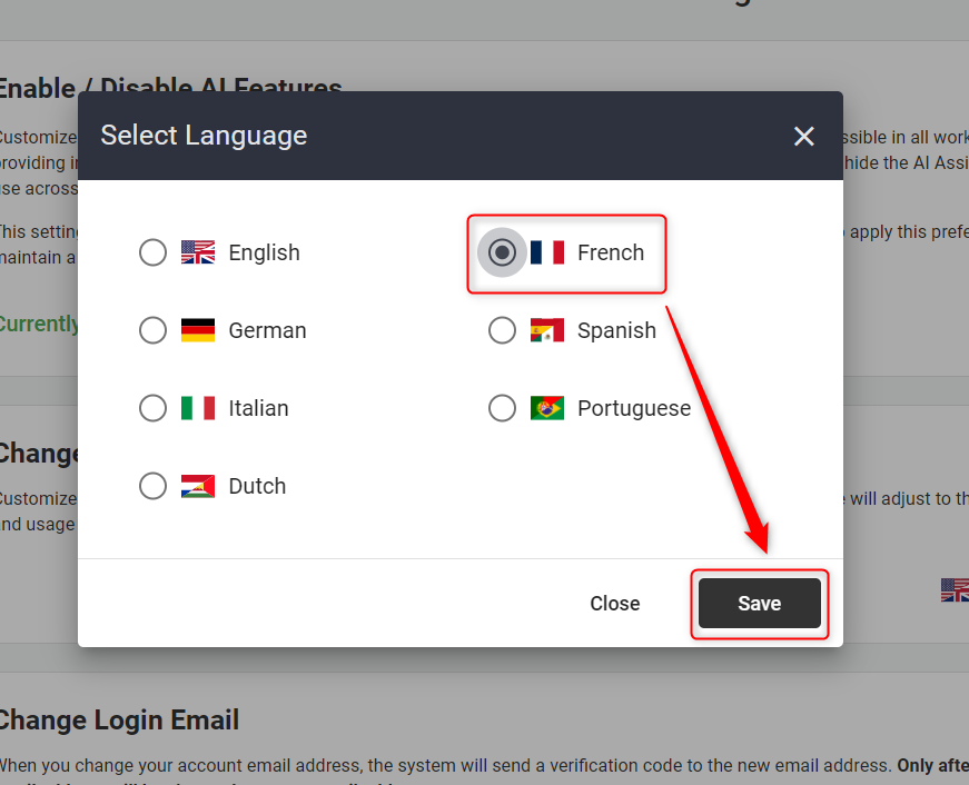 A pop-up will appear showing the available languages, such as English, French, German, Spanish, Italian, Portuguese, and Dutch. Choose your preferred language by clicking the corresponding radio button and clicking on save.