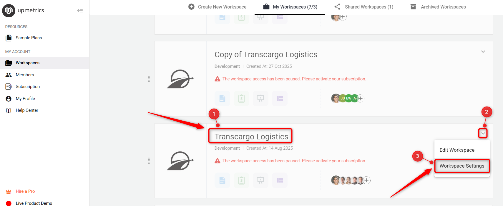 Once your account is on hold, navigate to the desired workspace and click on Workspace Settings.