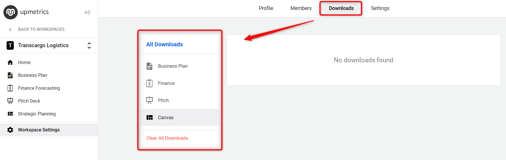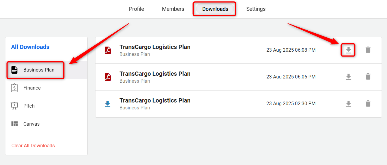 Here under the All Downloads section, you'll see options for Pitch, Business Plan, and Canvas. Select the relevant section based on what you need to download.