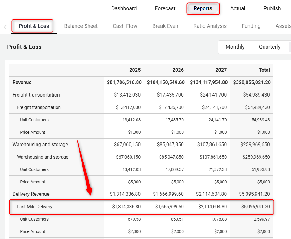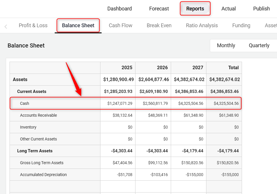 Your revenue streams will be used to calculate the highlighted lines in the Profit & Loss and Balance Sheets report shown below: