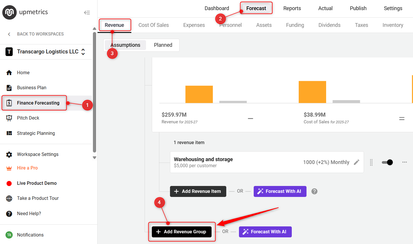 In your Finance Forecasting module, navigate to the Revenue tab and click on the Add Revenue Group option: