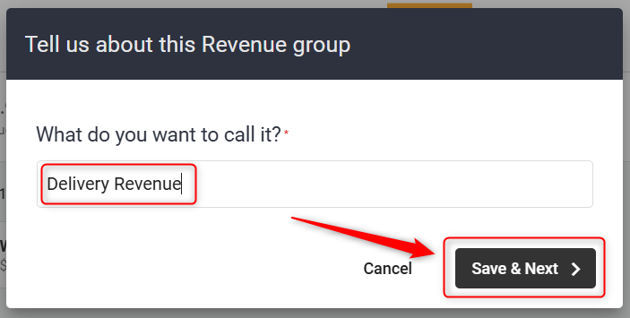 A pop-up will appear. Enter the Revenue Stream group title, then click on Save & Next. A Forecast Form Overlay will open up for you to start entering Revenue Item Details. You may close this form and review the Revenue Group you just created.