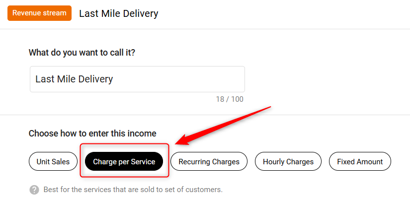 If you want to enter the number of customers you expect to sell your service to, along with the price for each service, choose the service sales revenue stream model, and the system will calculate the totals automatically.