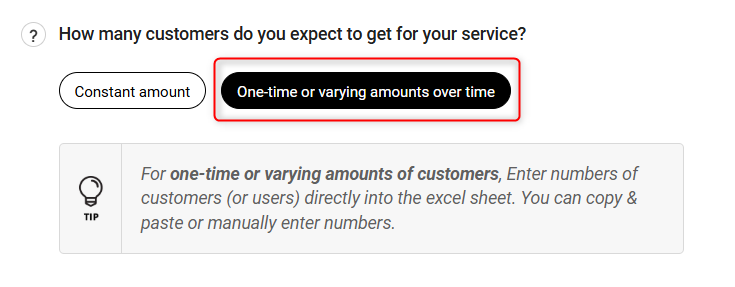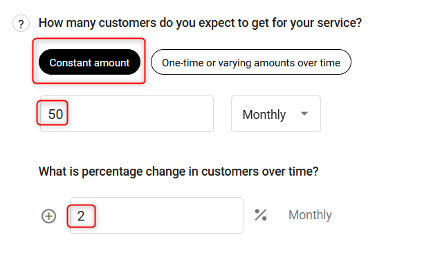 Customers: Enter the number of customers of this service you think you'll sell. This can be either a constant amount per month or year, or varying amounts.
