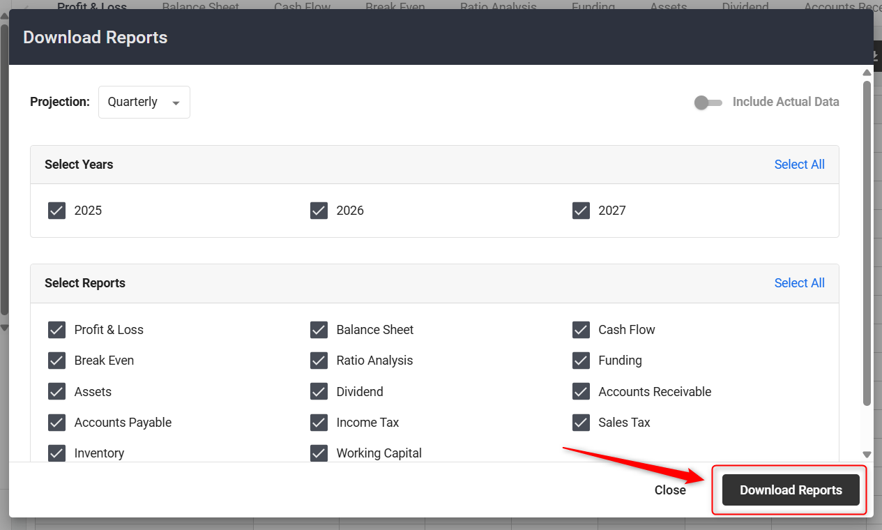 After setting up your scenarios, you have the option to export or download the finance reports specific to each scenario.